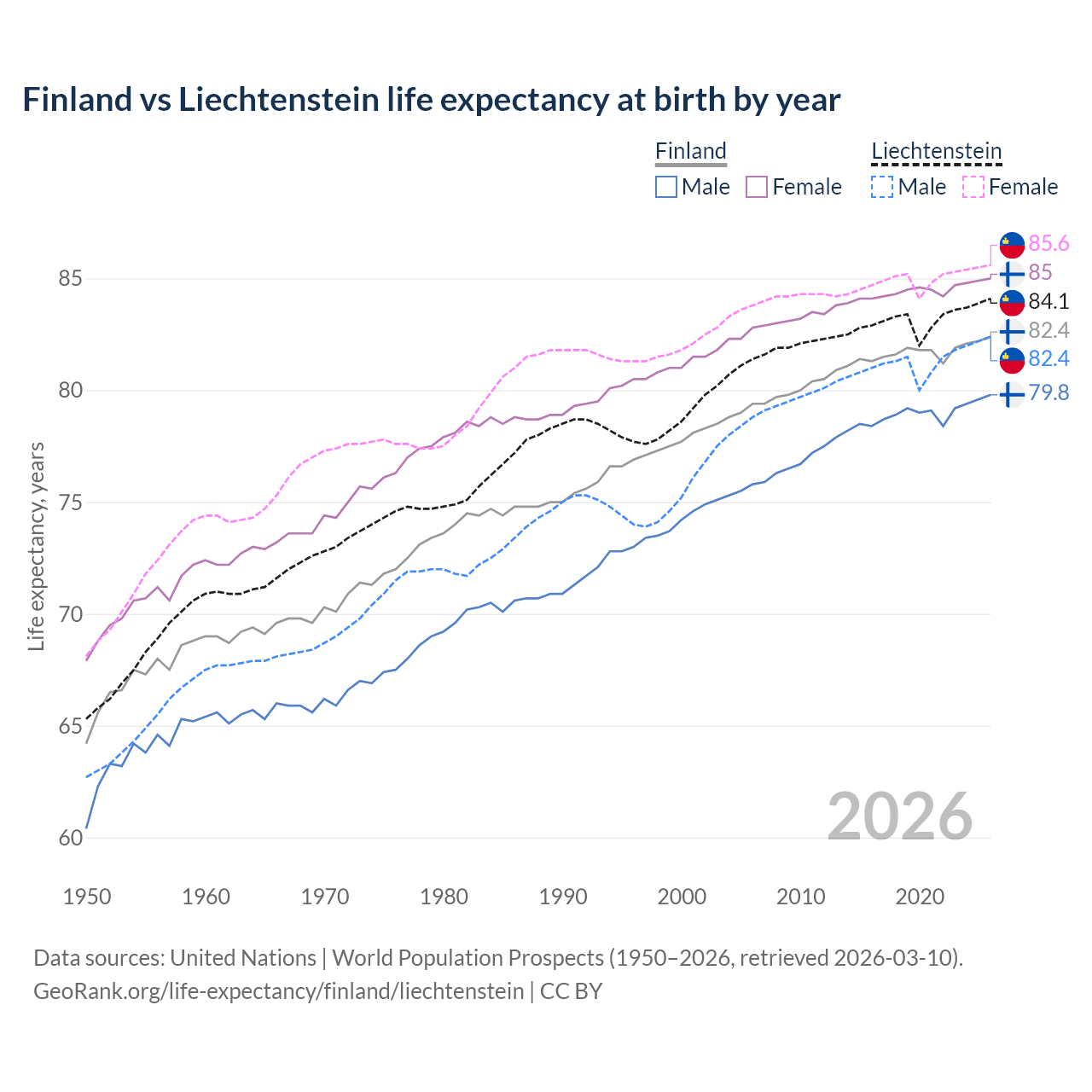 The average life expectancy at birth is 82.4 years in Finland vs 84.1 in Liechtenstein. Finland is ranked 29/197 by life expectancy, and Liechtenstein is 11/197. In Finland, the life expectancy is 79.8 years for males and 85 years for females. In Liechtenstein, it's 82.4 years for males and 85.6 years for females.