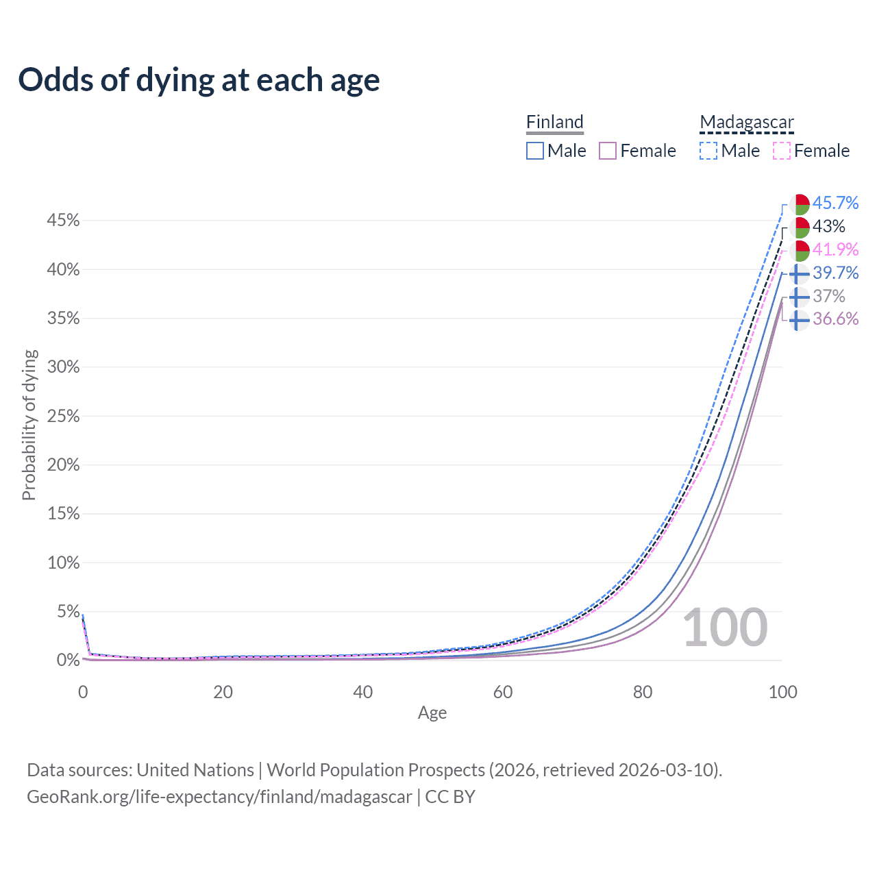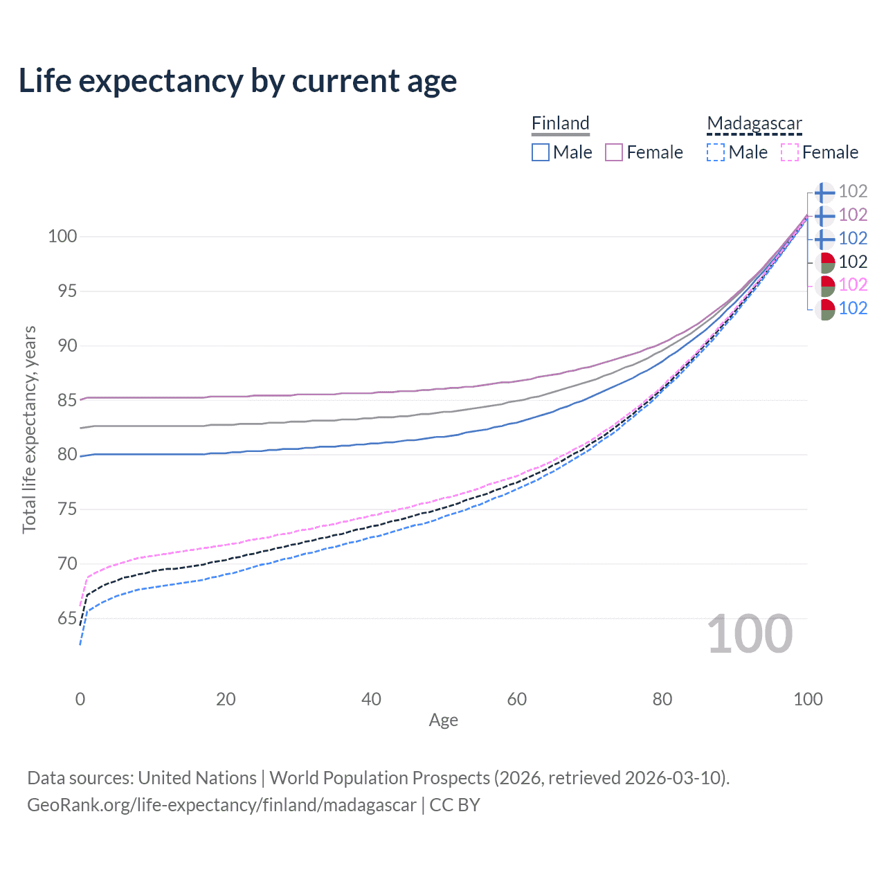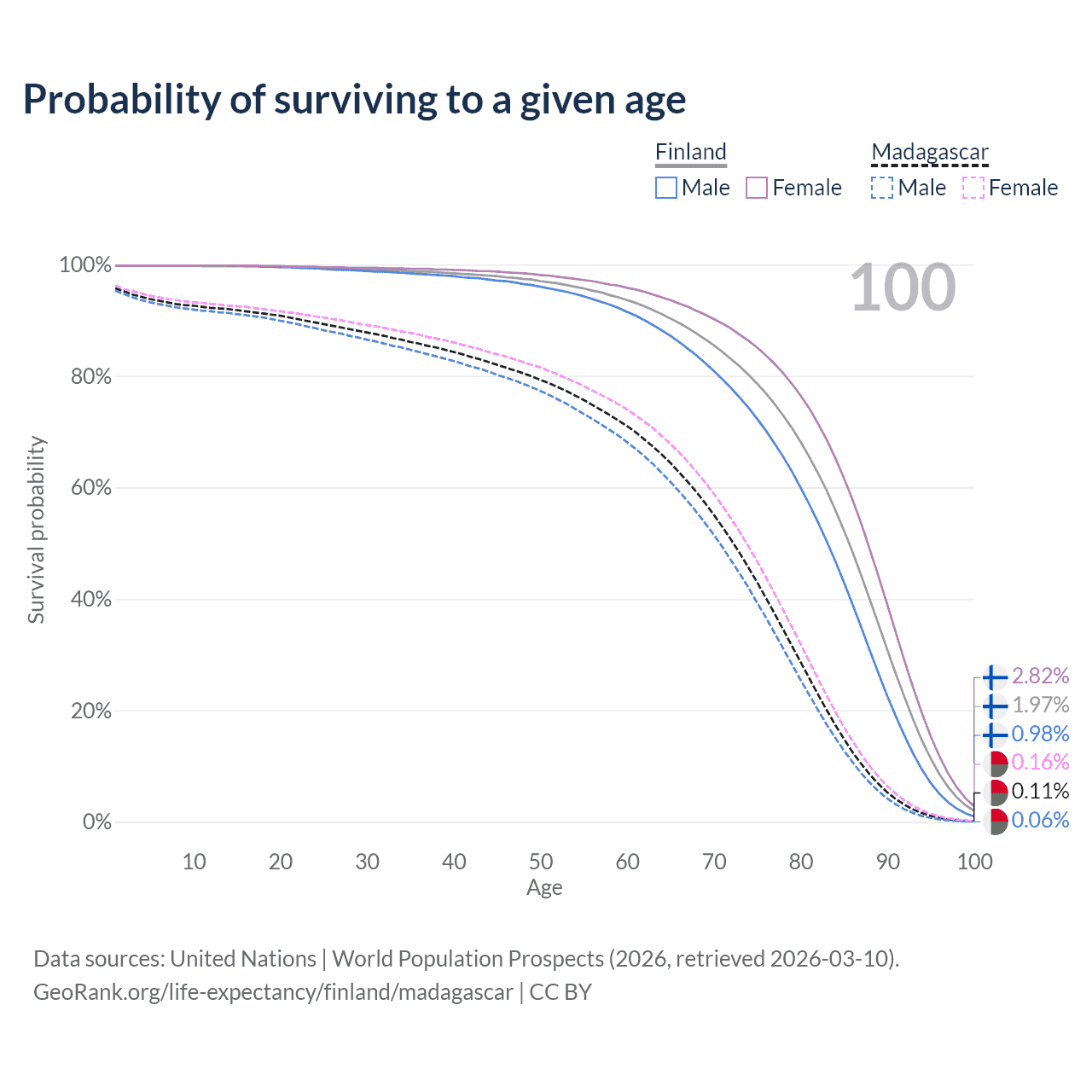 This life expectancy calculator shows the odds of living to 100, 95, 90, and below based on current age for both males and females in Finland and Madagascar, along with mean and median age of death. The calculations are based on the 2026 life tables (actuarial tables) from the UN World Population Prospects.