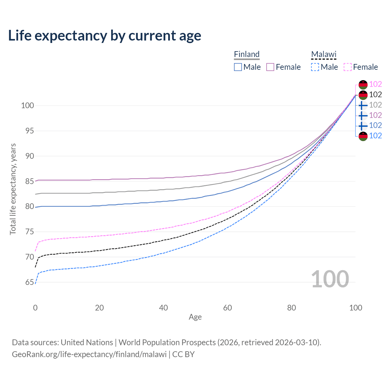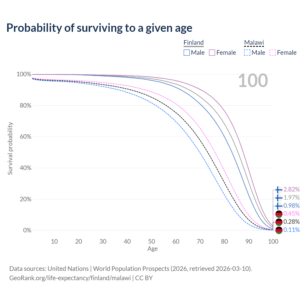 This life expectancy calculator shows the odds of living to 100, 95, 90, and below based on current age for both males and females in Finland and Malawi, along with mean and median age of death. The calculations are based on the 2026 life tables (actuarial tables) from the UN World Population Prospects.
