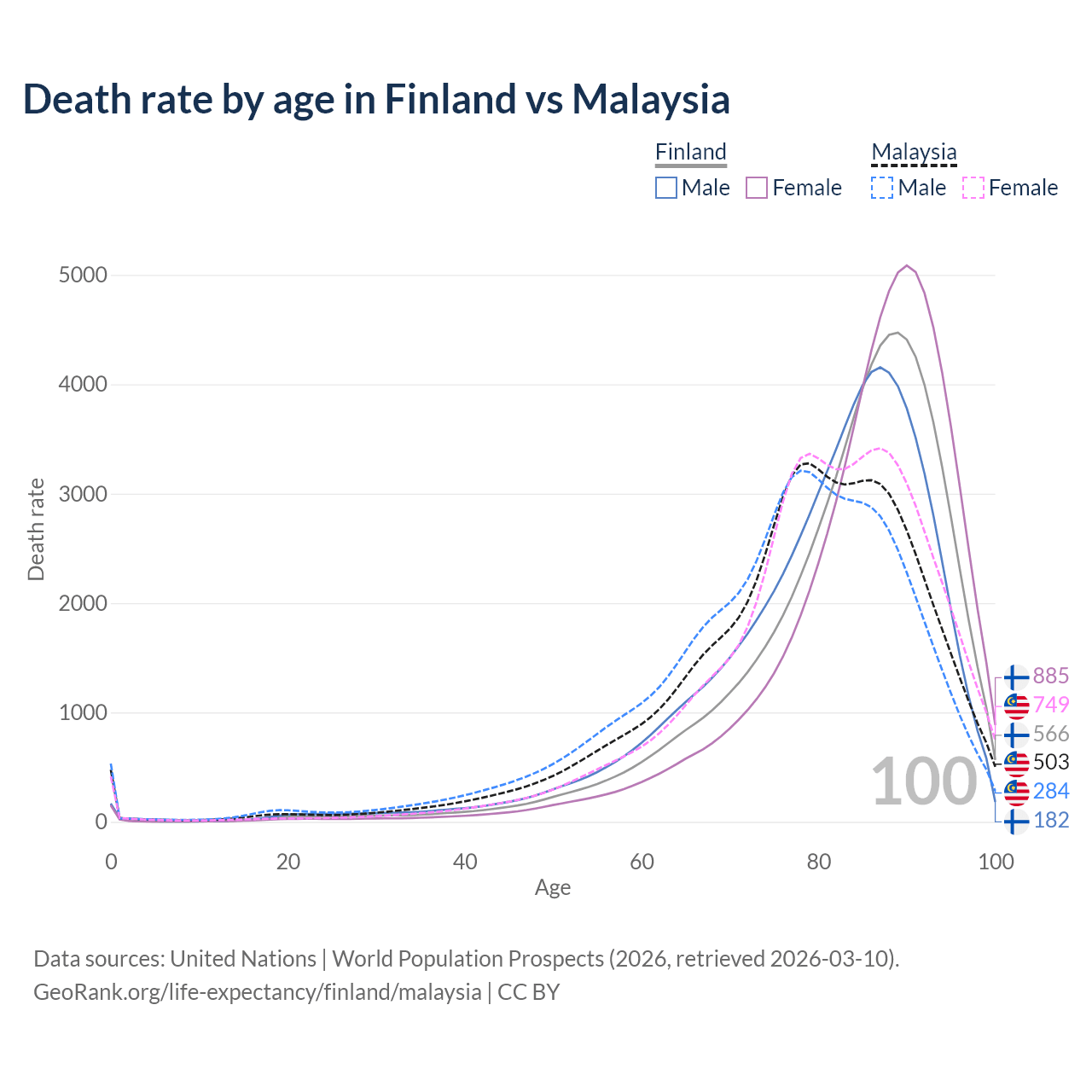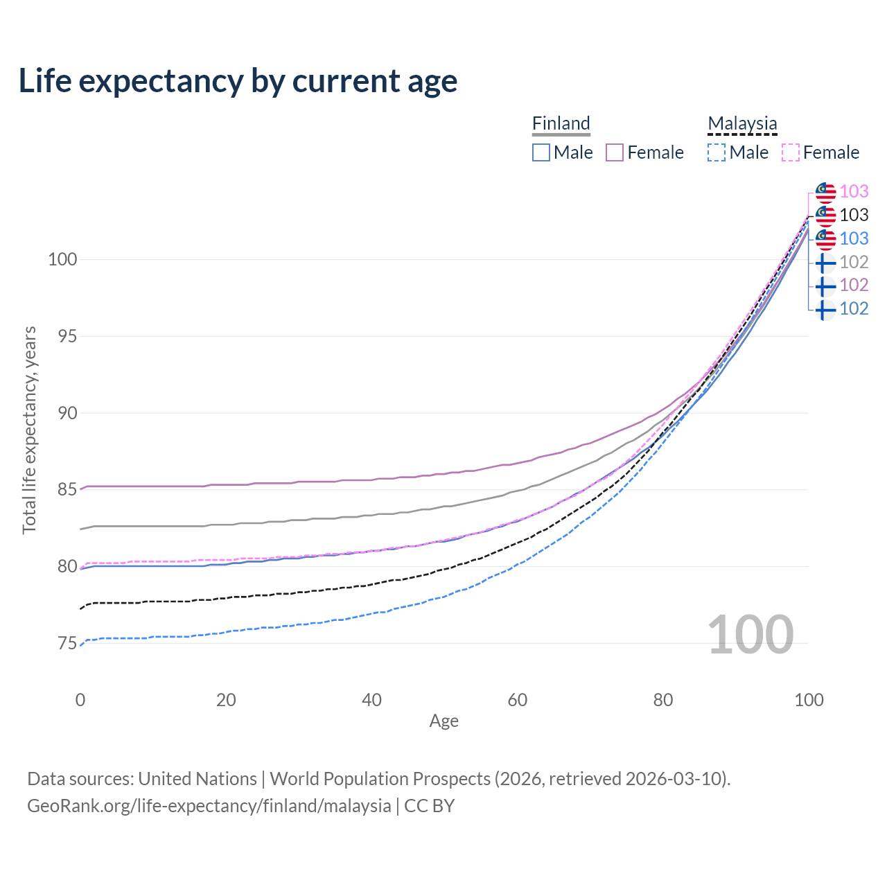 This life expectancy calculator shows the odds of living to 100, 95, 90, and below based on current age for both males and females in Finland and Malaysia, along with mean and median age of death. The calculations are based on the 2026 life tables (actuarial tables) from the UN World Population Prospects.