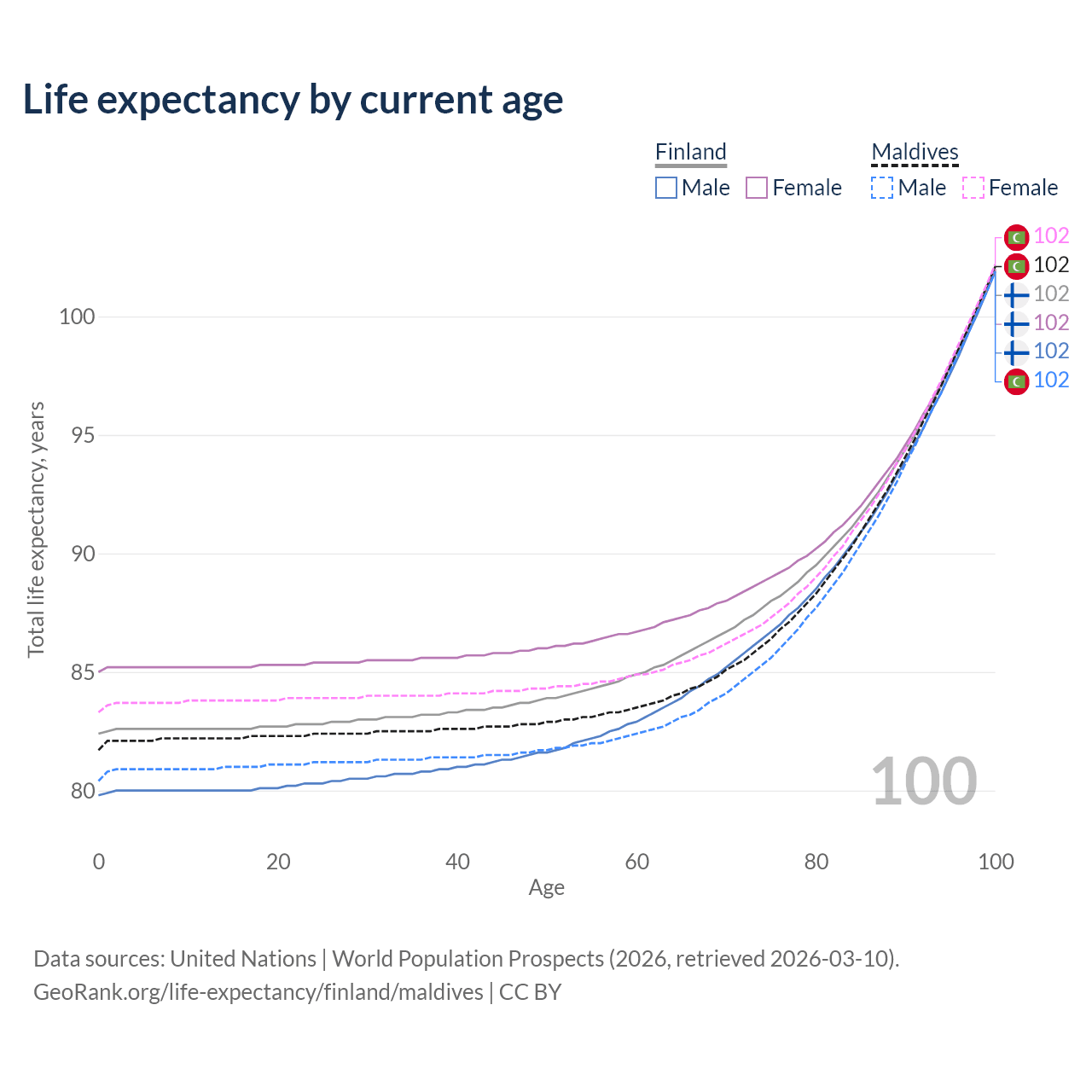 This life expectancy calculator shows the odds of living to 100, 95, 90, and below based on current age for both males and females in Finland and Maldives, along with mean and median age of death. The calculations are based on the 2026 life tables (actuarial tables) from the UN World Population Prospects.