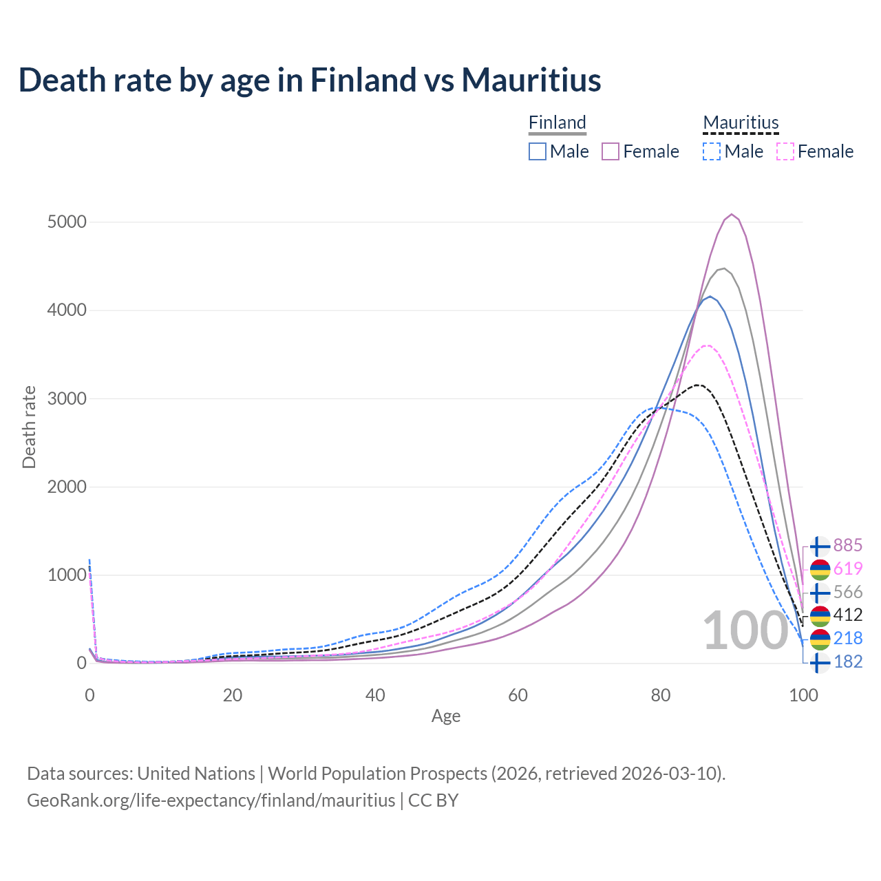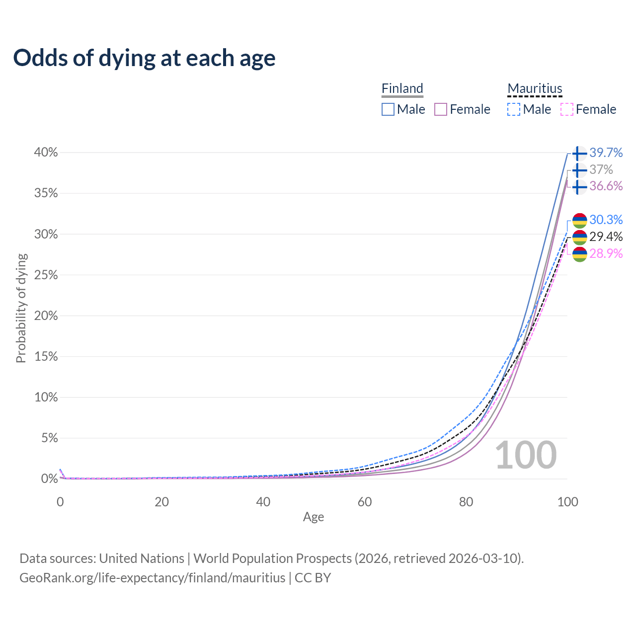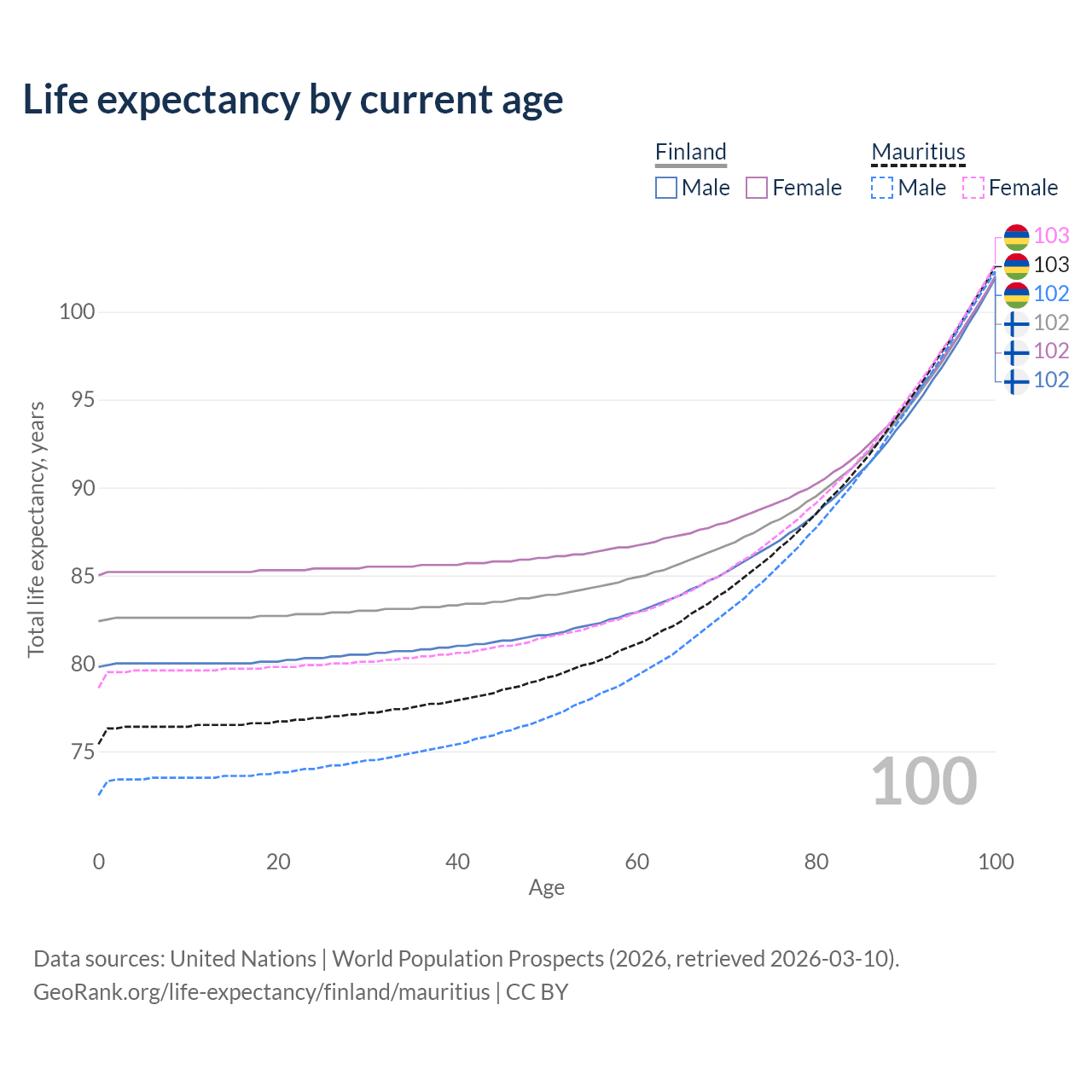This life expectancy calculator shows the odds of living to 100, 95, 90, and below based on current age for both males and females in Finland and Mauritius, along with mean and median age of death. The calculations are based on the 2026 life tables (actuarial tables) from the UN World Population Prospects.