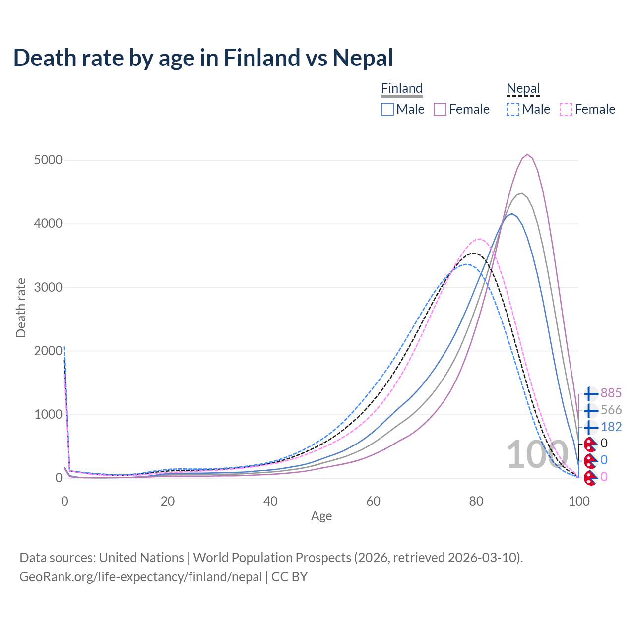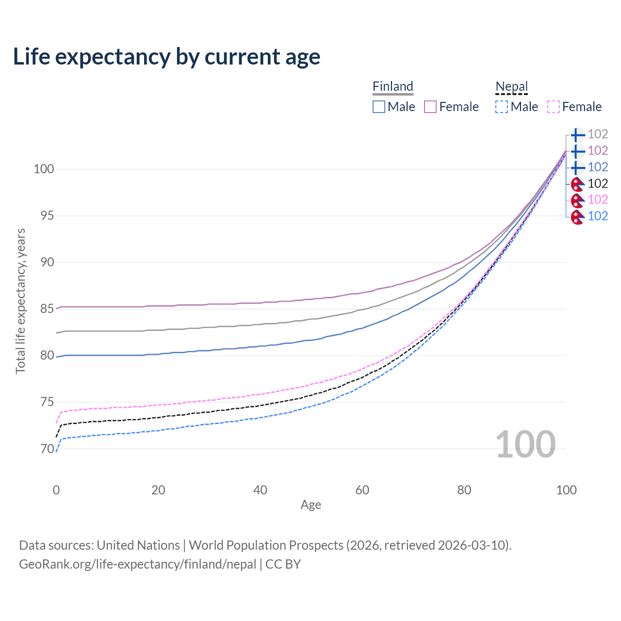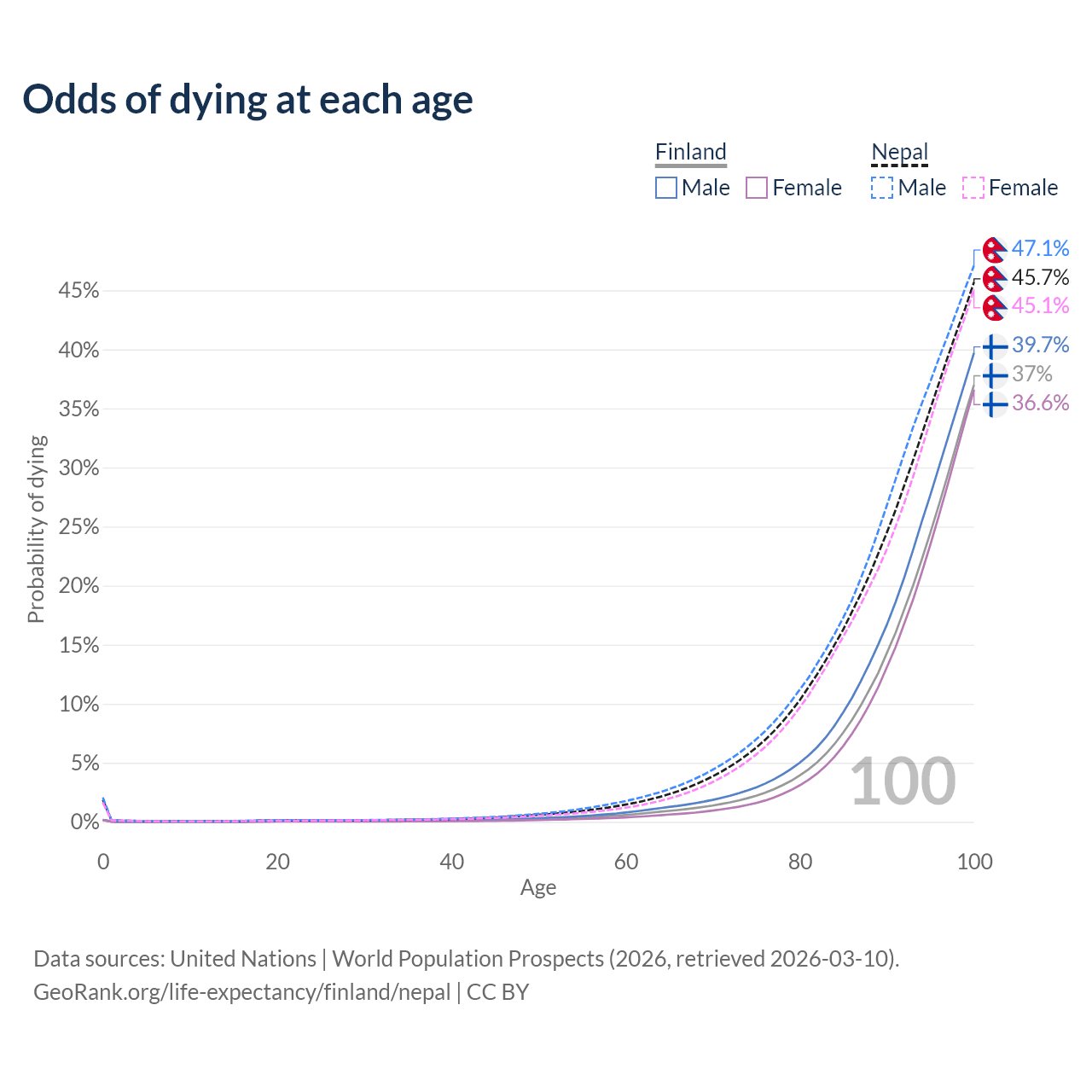 This life expectancy calculator shows the odds of living to 100, 95, 90, and below based on current age for both males and females in Finland and Nepal, along with mean and median age of death. The calculations are based on the 2026 life tables (actuarial tables) from the UN World Population Prospects.