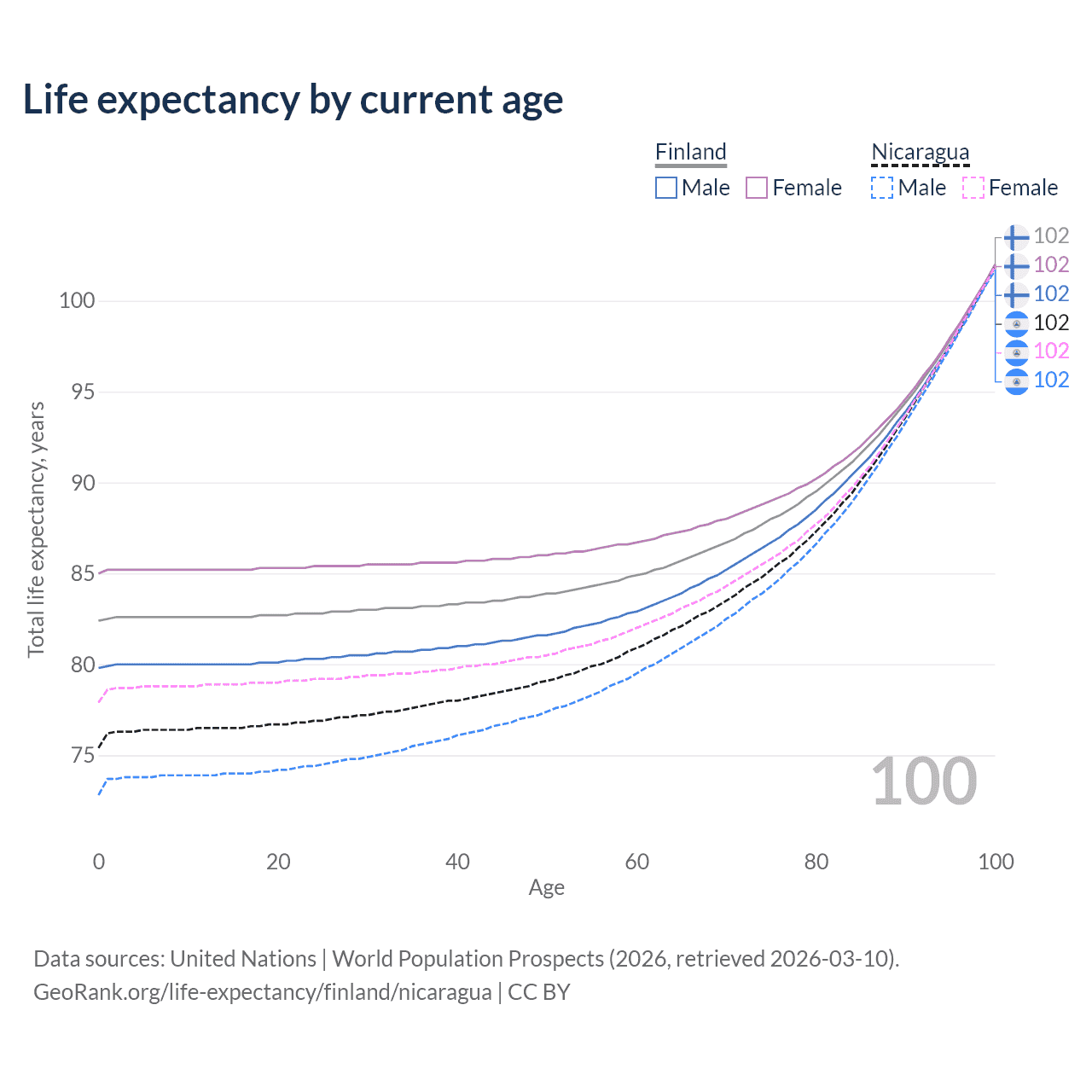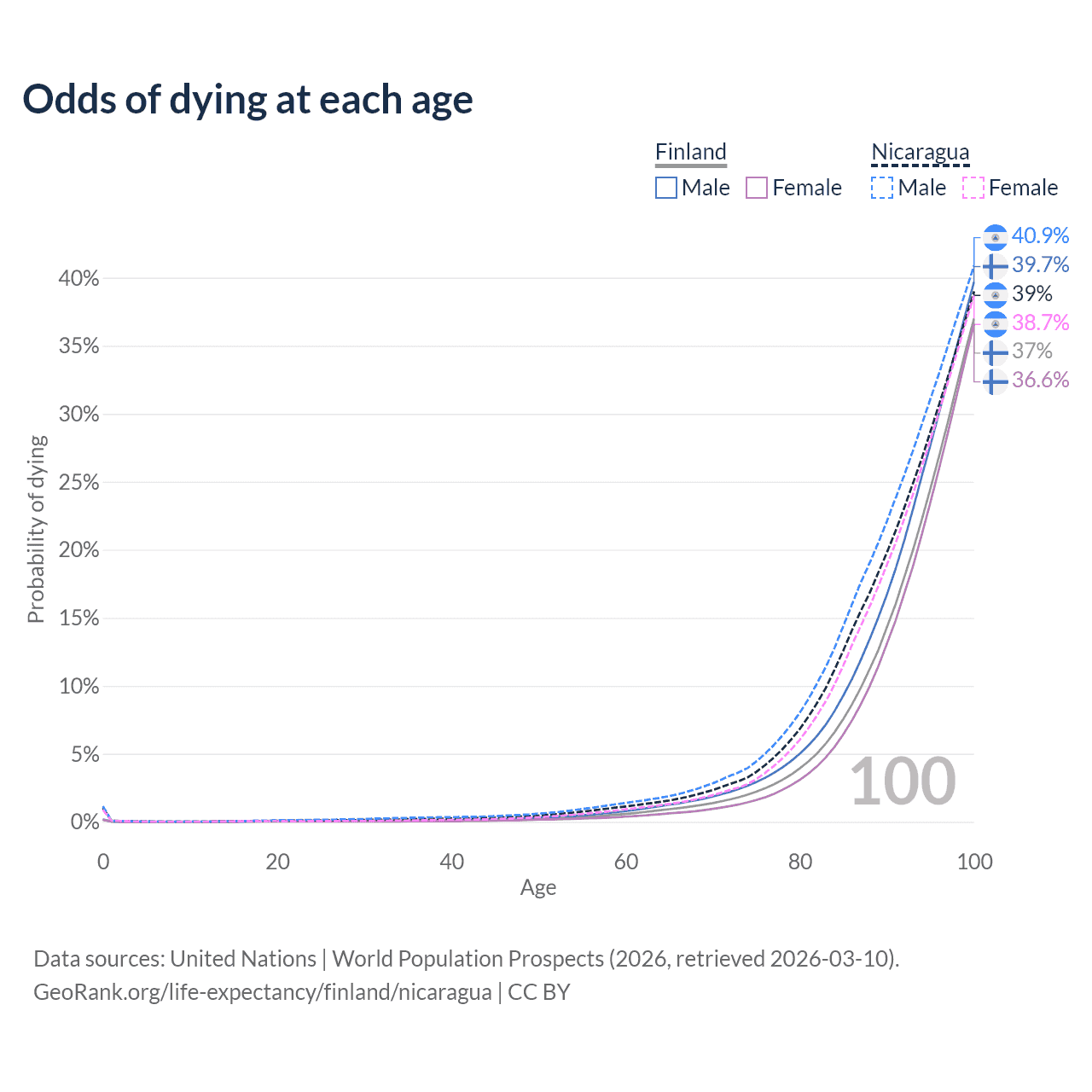 This life expectancy calculator shows the odds of living to 100, 95, 90, and below based on current age for both males and females in Finland and Nicaragua, along with mean and median age of death. The calculations are based on the 2026 life tables (actuarial tables) from the UN World Population Prospects.