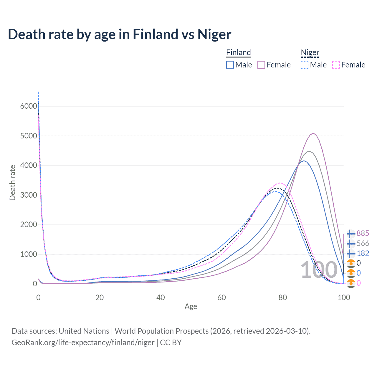 In Finland, the most common age of death is 89, compared to 0 in Niger. The median age of death is 85.6 in Finland and 71.7 in Niger, meaning only half of each cohort is expected to live past that age.