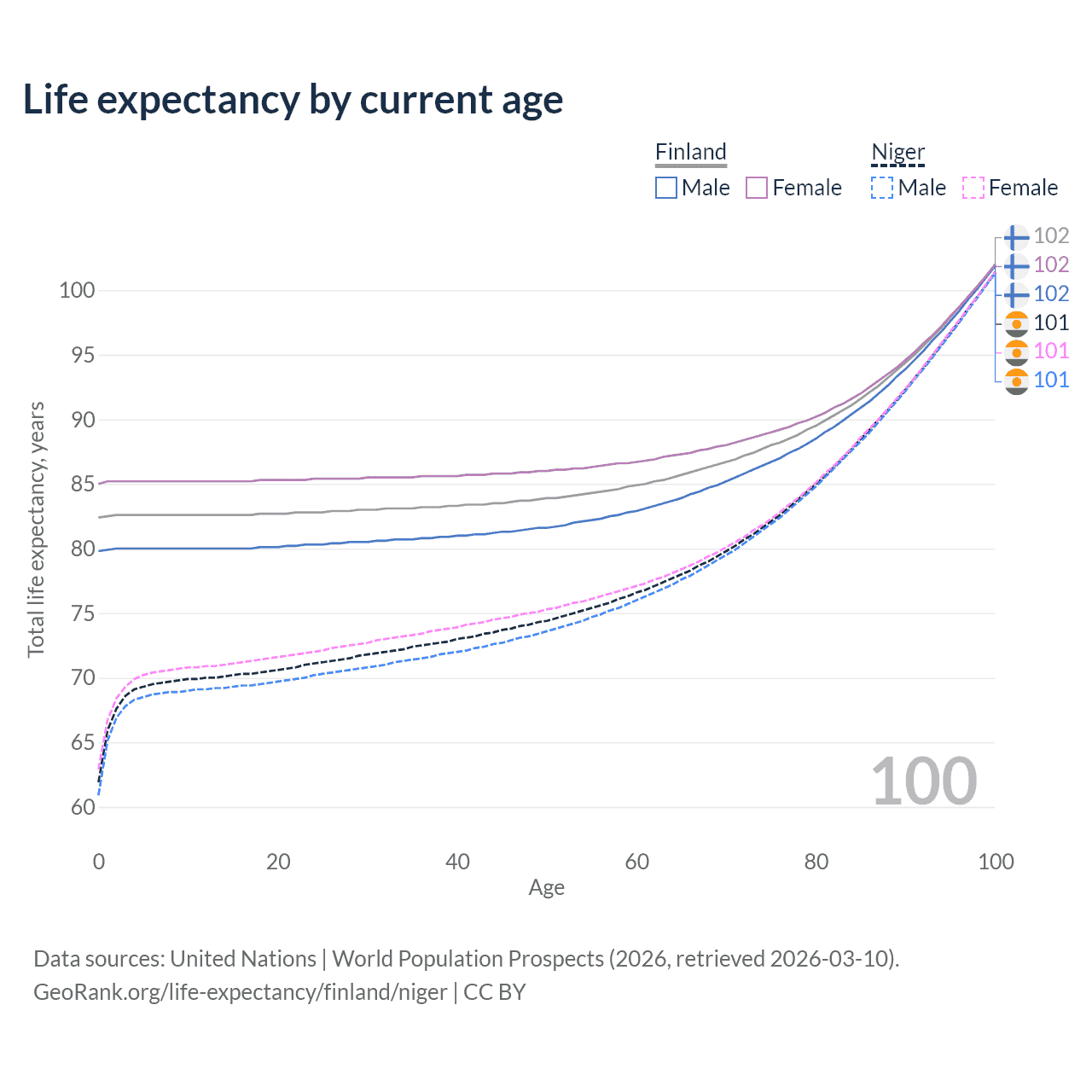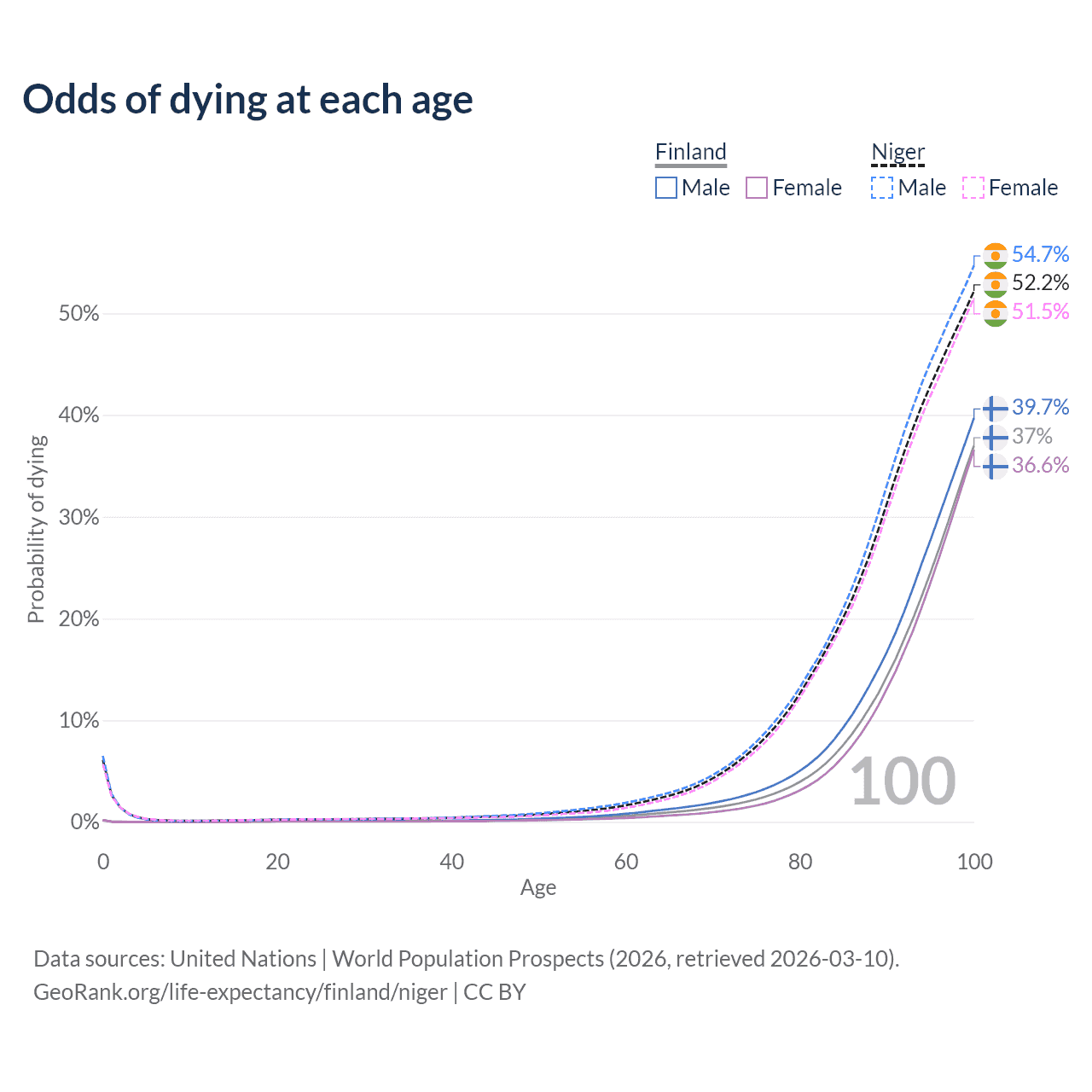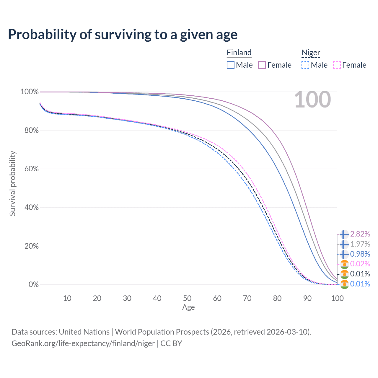 This life expectancy calculator shows the odds of living to 100, 95, 90, and below based on current age for both males and females in Finland and Niger, along with mean and median age of death. The calculations are based on the 2026 life tables (actuarial tables) from the UN World Population Prospects.