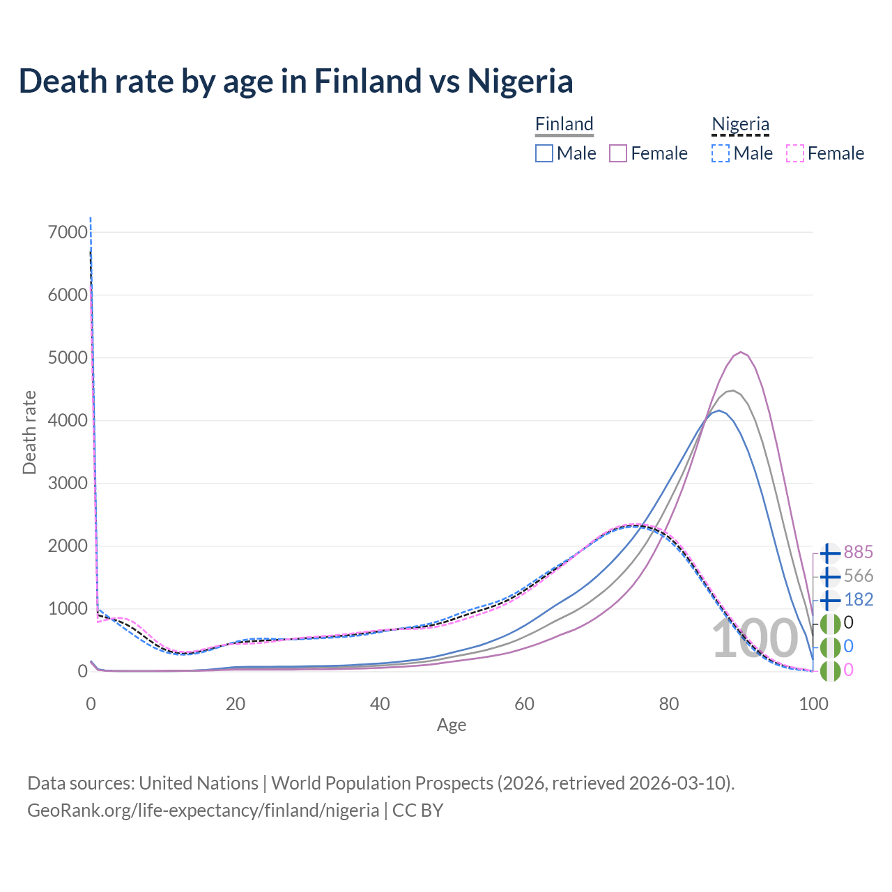 In Finland, the most common age of death is 89, compared to 0 in Nigeria. The median age of death is 85.6 in Finland and 64.3 in Nigeria, meaning only half of each cohort is expected to live past that age.