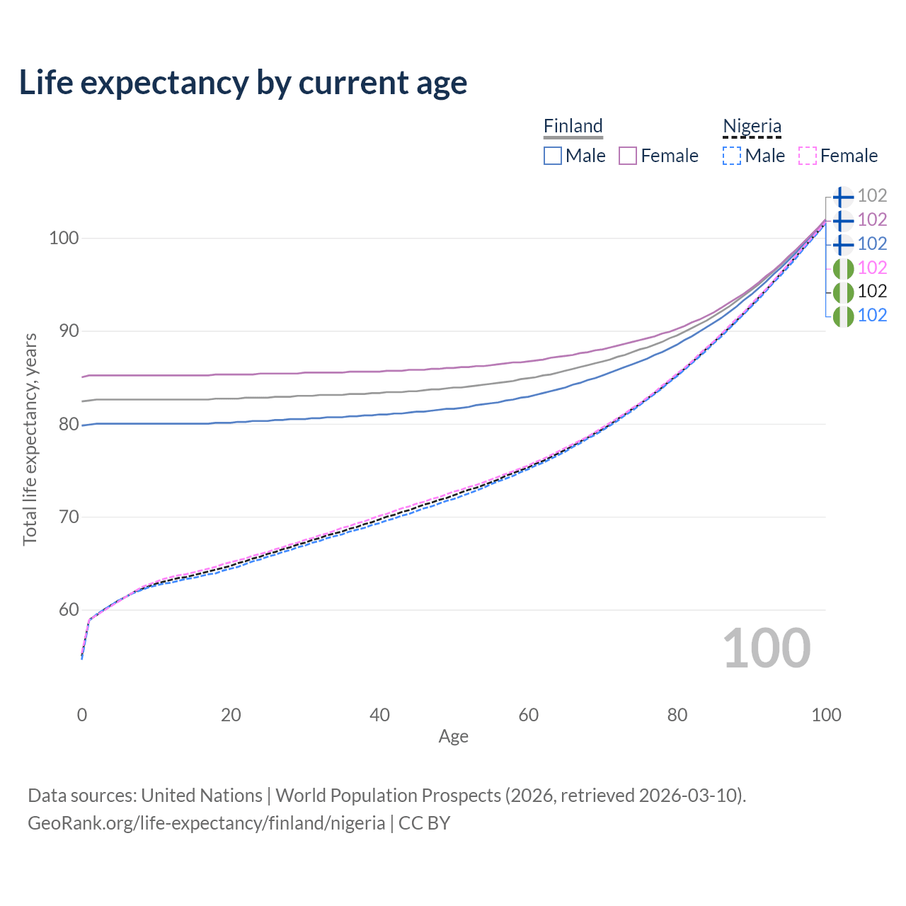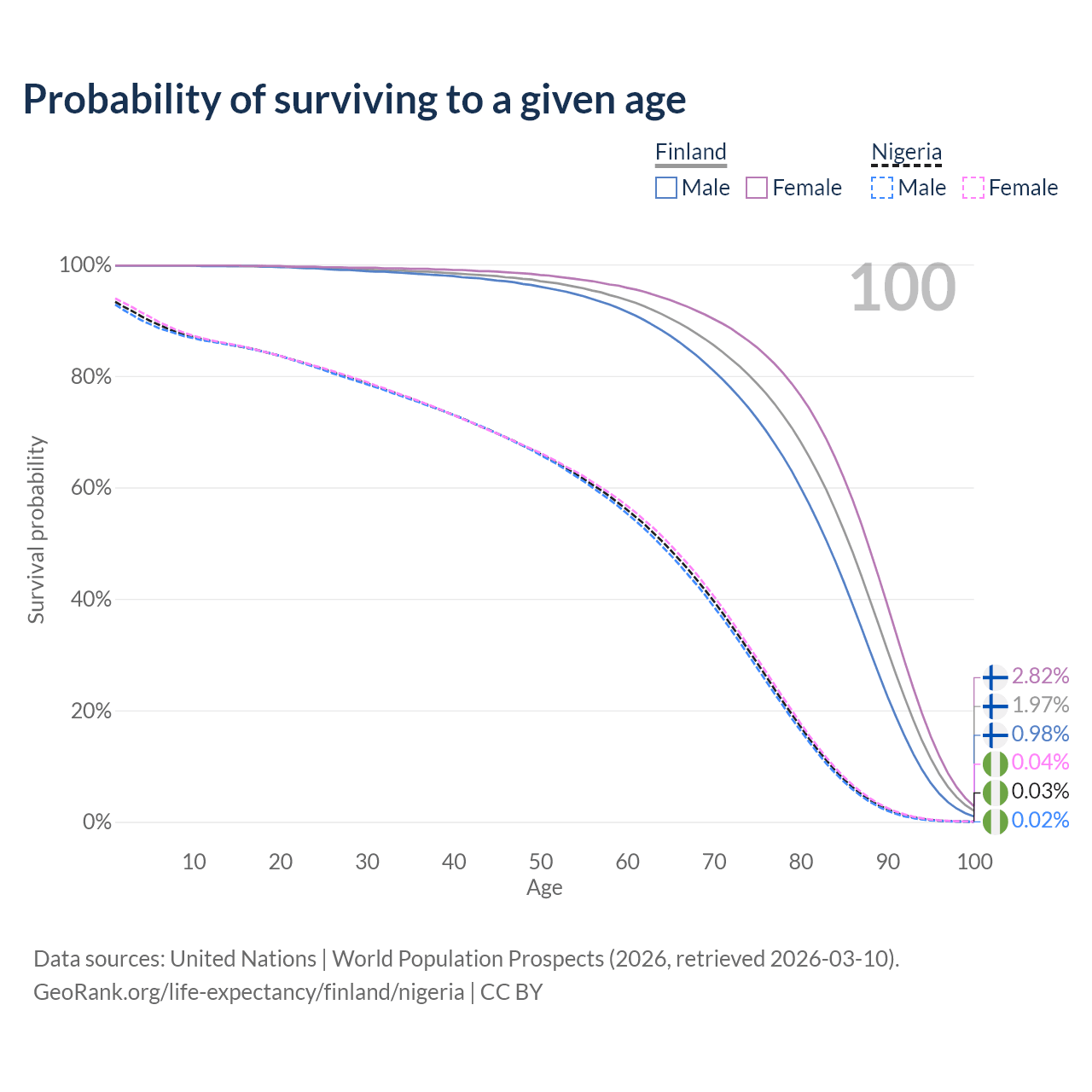 This life expectancy calculator shows the odds of living to 100, 95, 90, and below based on current age for both males and females in Finland and Nigeria, along with mean and median age of death. The calculations are based on the 2026 life tables (actuarial tables) from the UN World Population Prospects.