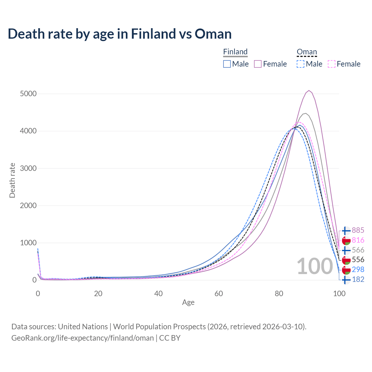 In Finland, the most common age of death is 89, compared to 86 in Oman. The median age of death is 85.6 in Finland and 83.5 in Oman, meaning only half of each cohort is expected to live past that age.