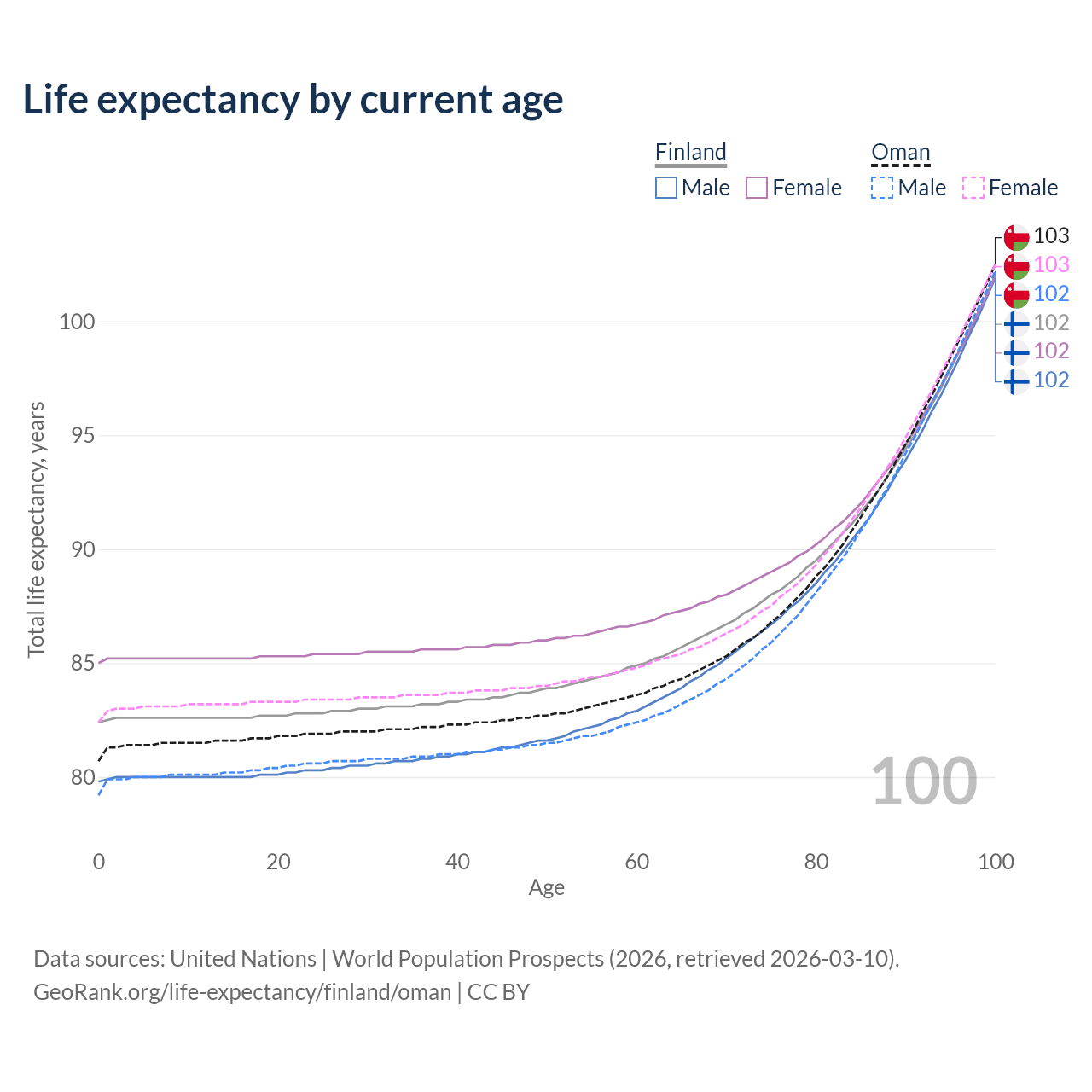 The average life expectancy at birth is 82.4 years in Finland vs 80.7 in Oman. Finland is ranked 29/197 by life expectancy, and Oman is 43/197. In Finland, the life expectancy is 79.8 years for males and 85 years for females. In Oman, it's 79.2 years for males and 82.4 years for females.