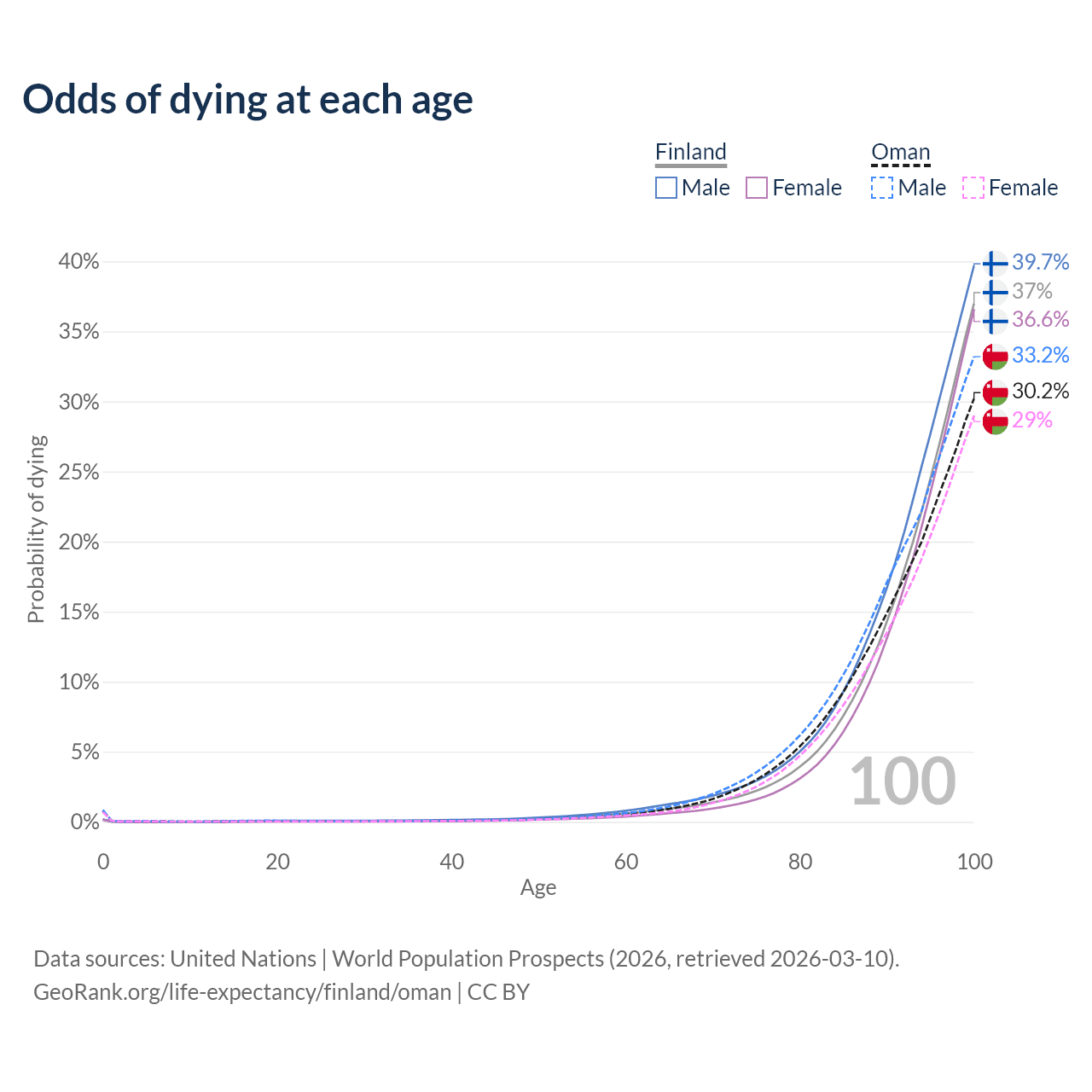 This life expectancy calculator shows the odds of living to 100, 95, 90, and below based on current age for both males and females in Finland and Oman, along with mean and median age of death. The calculations are based on the 2026 life tables (actuarial tables) from the UN World Population Prospects.