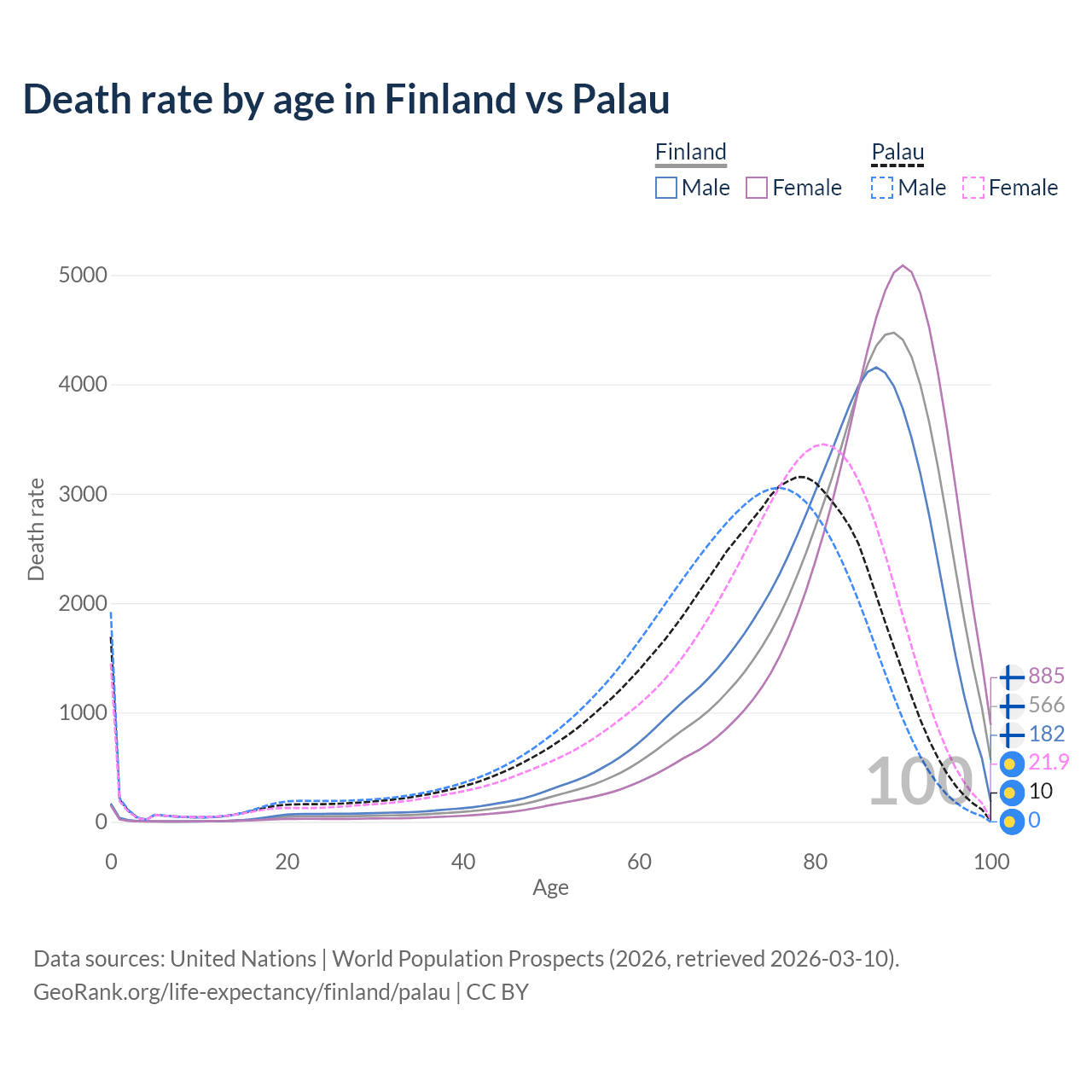 In Finland, the most common age of death is 89, compared to 78 in Palau. The median age of death is 85.6 in Finland and 73.8 in Palau, meaning only half of each cohort is expected to live past that age.