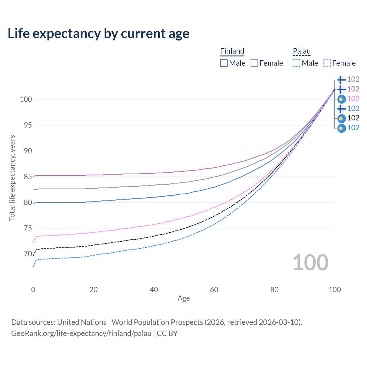 This life expectancy calculator shows the odds of living to 100, 95, 90, and below based on current age for both males and females in Finland and Palau, along with mean and median age of death. The calculations are based on the 2026 life tables (actuarial tables) from the UN World Population Prospects.