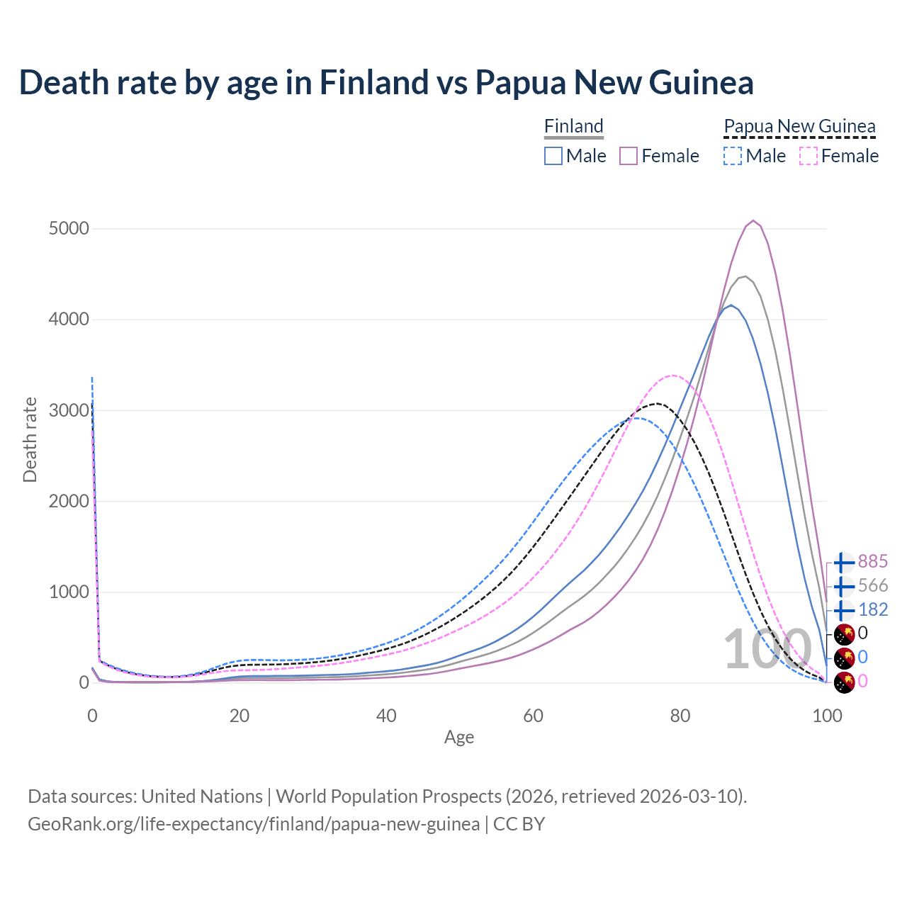 In Finland, the most common age of death is 89, compared to 0 in Papua New Guinea. The median age of death is 85.6 in Finland and 71.7 in Papua New Guinea, meaning only half of each cohort is expected to live past that age.