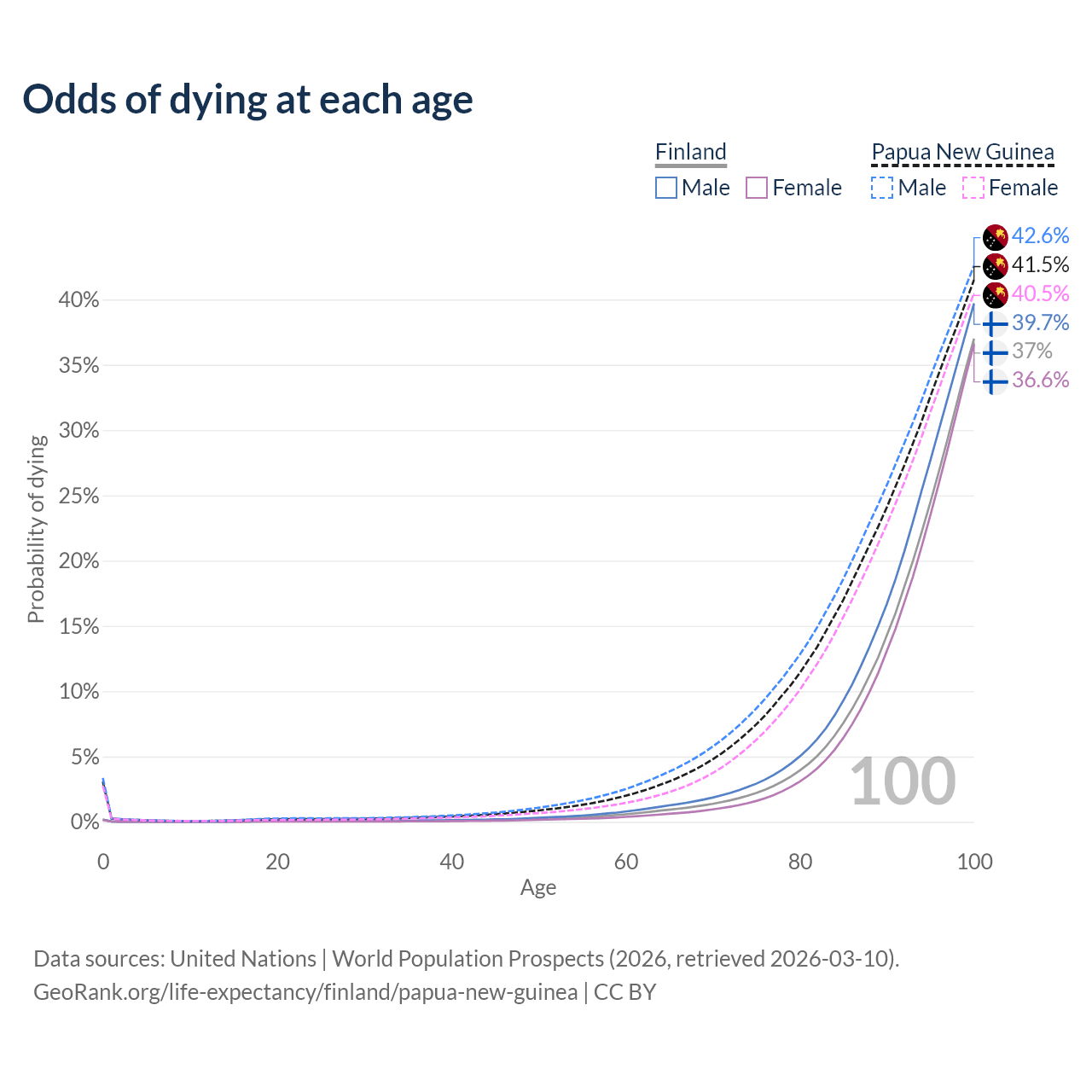 This life expectancy calculator shows the odds of living to 100, 95, 90, and below based on current age for both males and females in Finland and Papua New Guinea, along with mean and median age of death. The calculations are based on the 2026 life tables (actuarial tables) from the UN World Population Prospects.