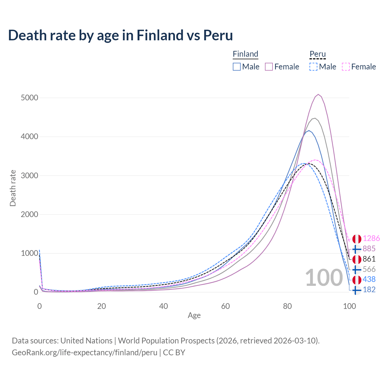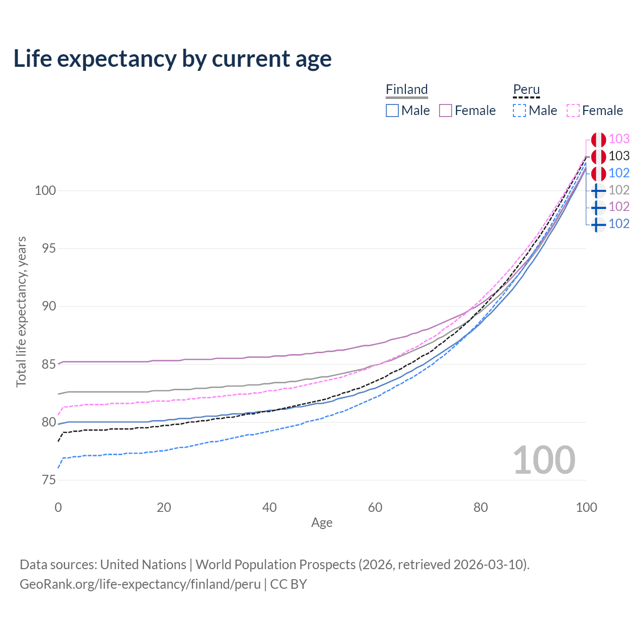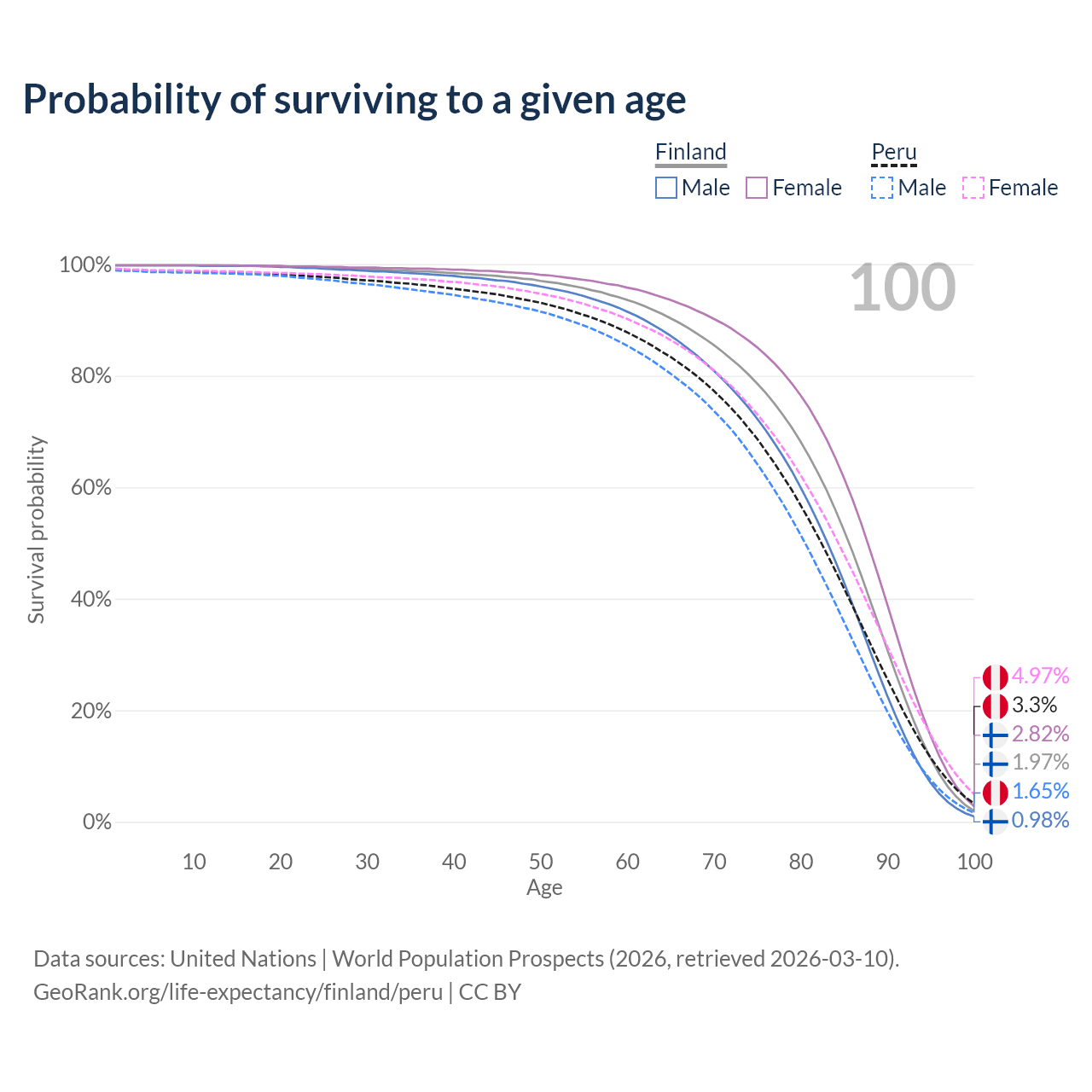 This life expectancy calculator shows the odds of living to 100, 95, 90, and below based on current age for both males and females in Finland and Peru, along with mean and median age of death. The calculations are based on the 2026 life tables (actuarial tables) from the UN World Population Prospects.