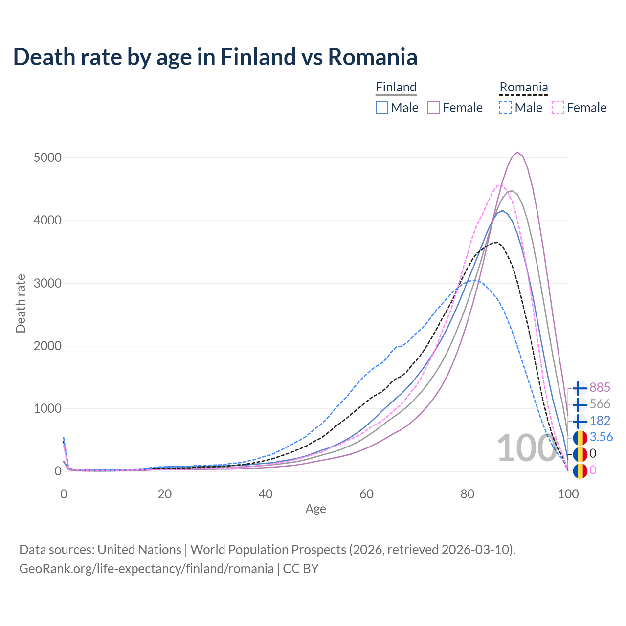 In Finland, the most common age of death is 89, compared to 86 in Romania. The median age of death is 85.6 in Finland and 79.9 in Romania, meaning only half of each cohort is expected to live past that age.
