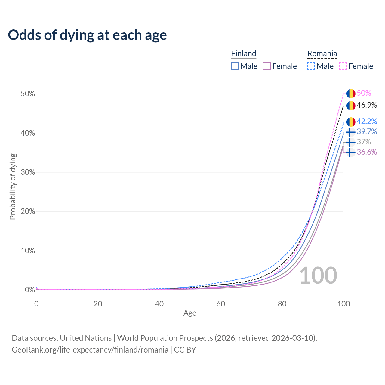 This life expectancy calculator shows the odds of living to 100, 95, 90, and below based on current age for both males and females in Finland and Romania, along with mean and median age of death. The calculations are based on the 2026 life tables (actuarial tables) from the UN World Population Prospects.