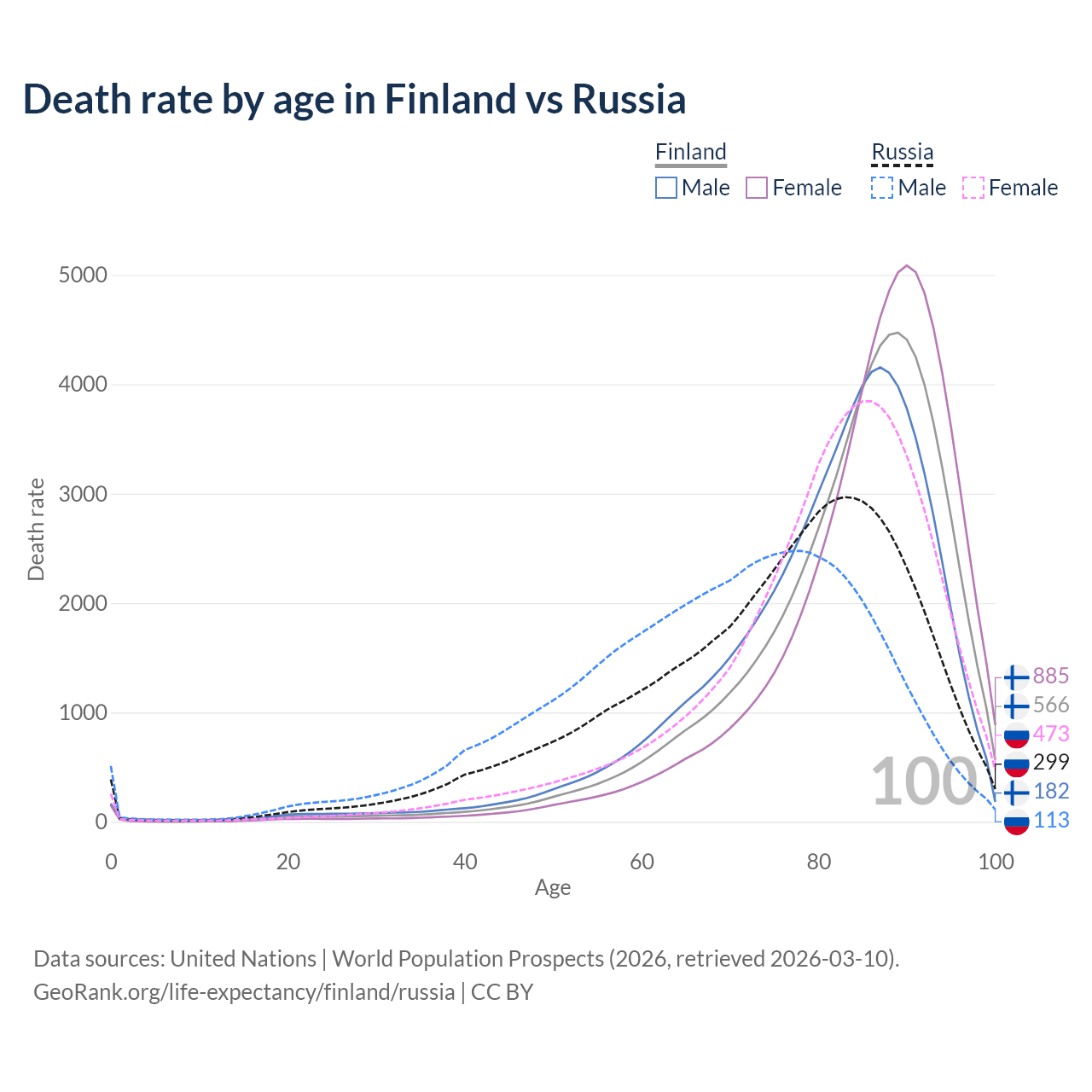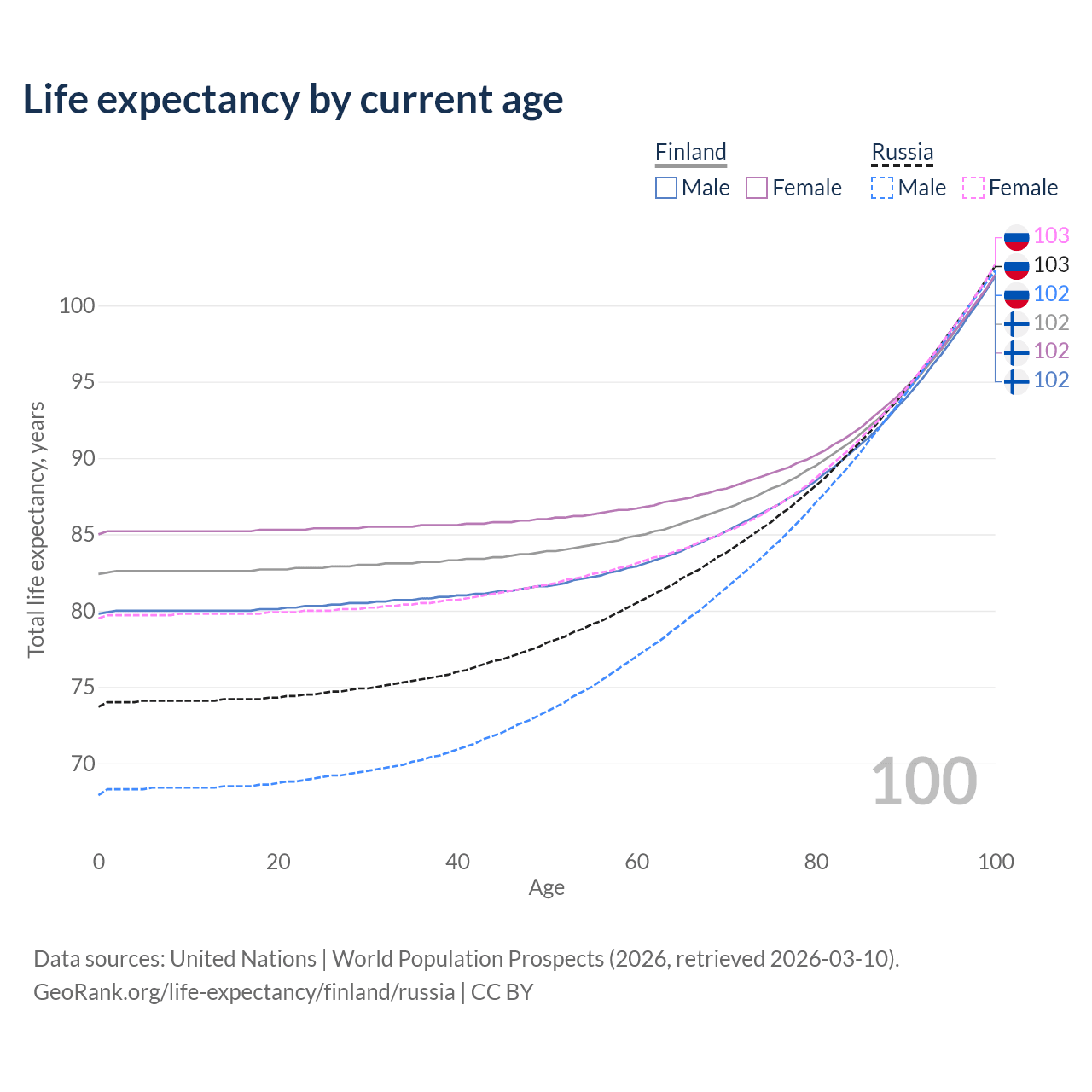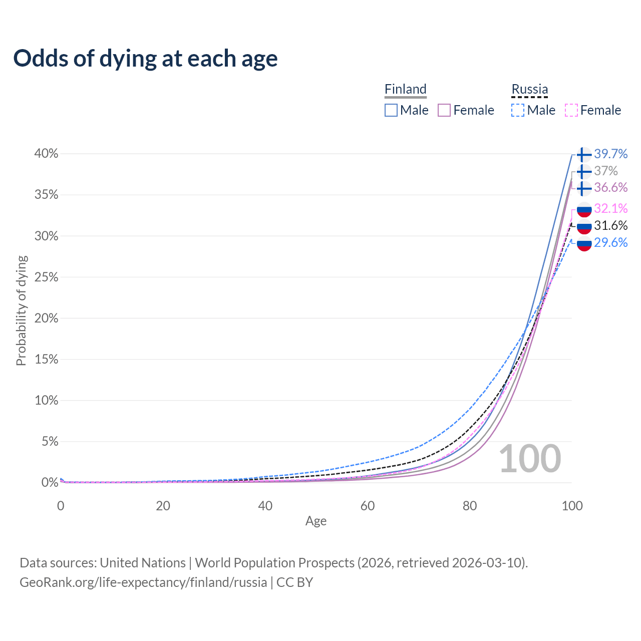 This life expectancy calculator shows the odds of living to 100, 95, 90, and below based on current age for both males and females in Finland and Russia, along with mean and median age of death. The calculations are based on the 2026 life tables (actuarial tables) from the UN World Population Prospects.