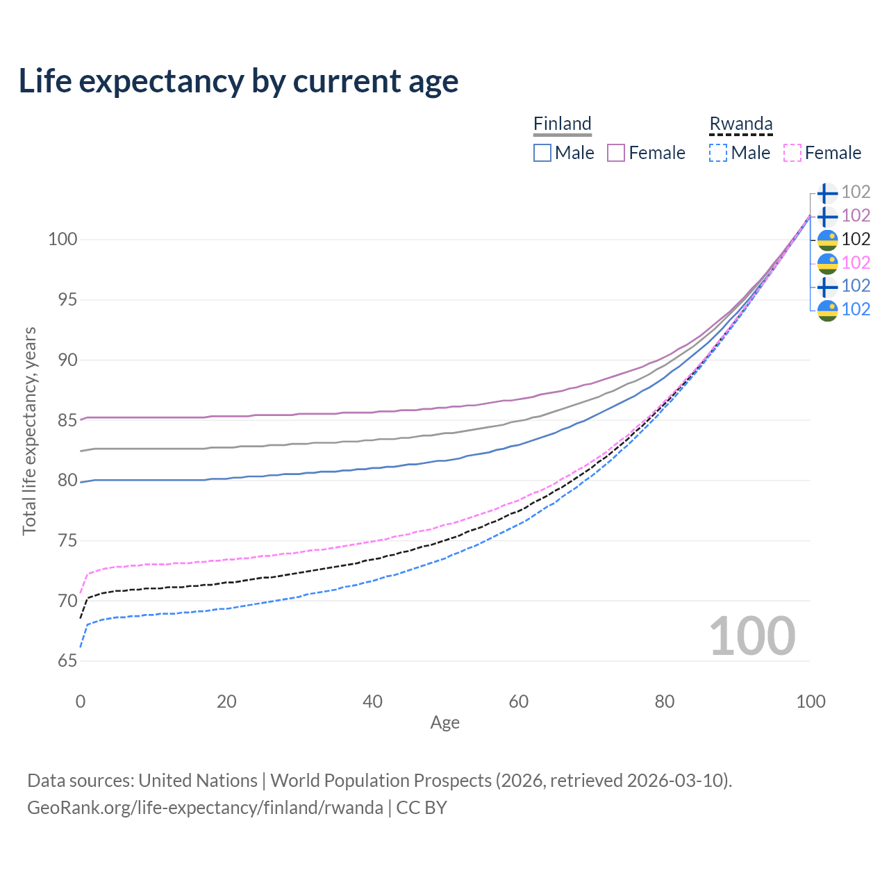 This life expectancy calculator shows the odds of living to 100, 95, 90, and below based on current age for both males and females in Finland and Rwanda, along with mean and median age of death. The calculations are based on the 2026 life tables (actuarial tables) from the UN World Population Prospects.