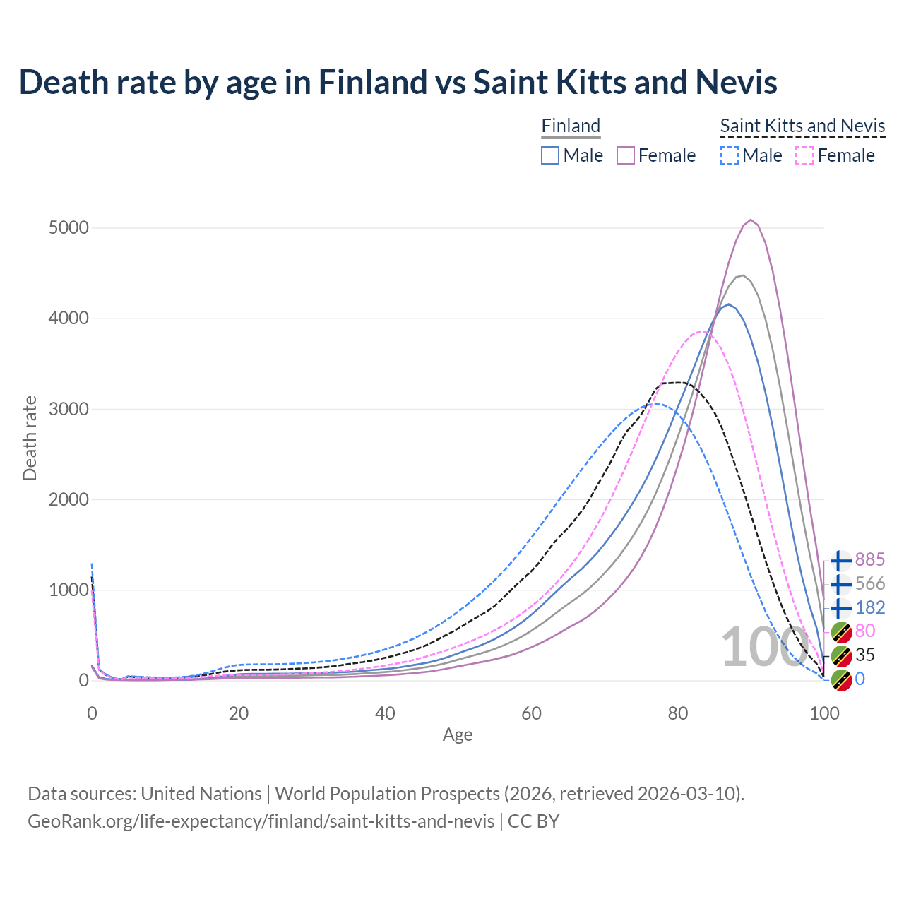This life expectancy calculator shows the odds of living to 100, 95, 90, and below based on current age for both males and females in Finland and Saint Kitts and Nevis, along with mean and median age of death. The calculations are based on the 2026 life tables (actuarial tables) from the UN World Population Prospects.