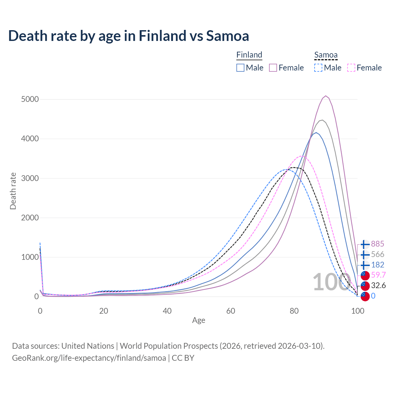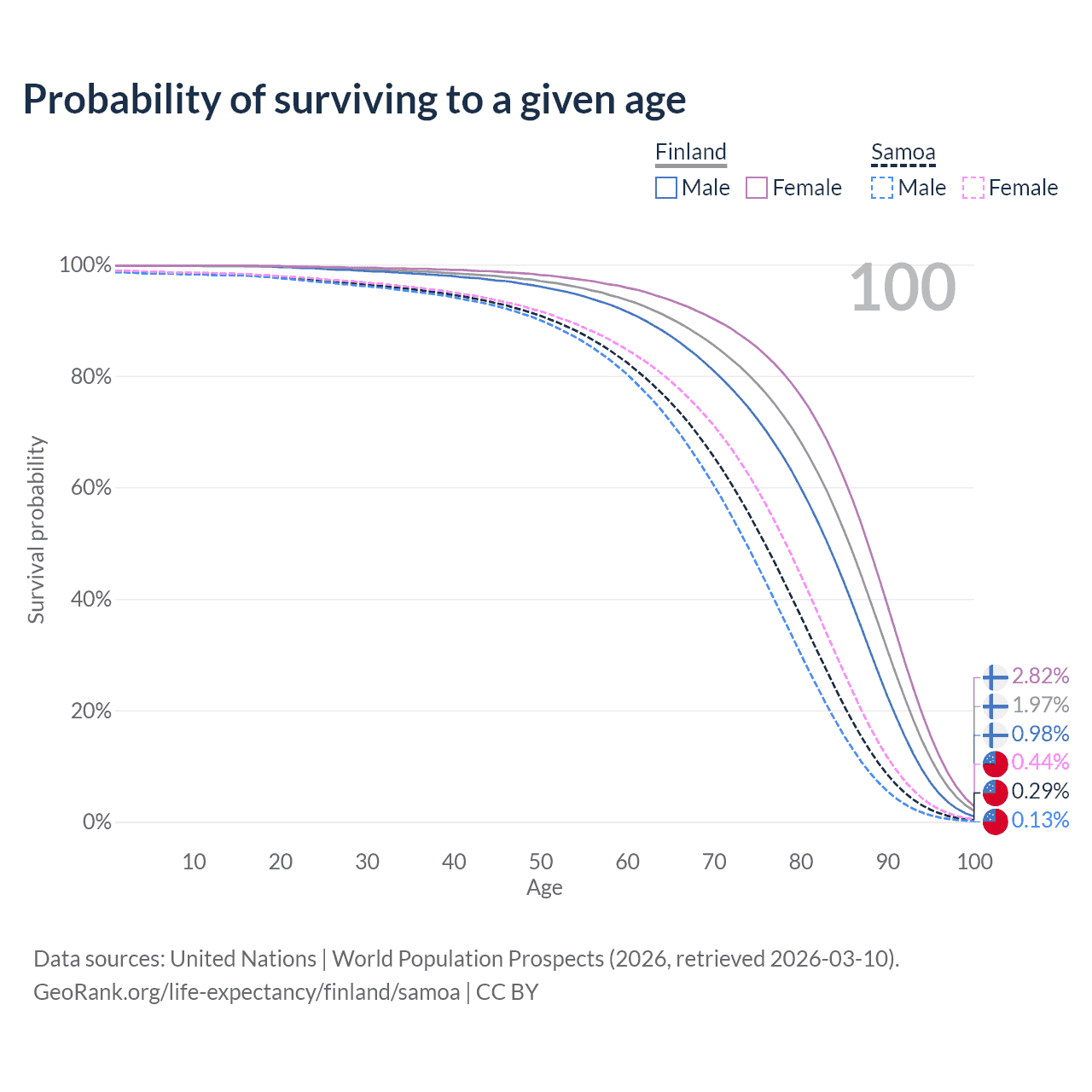 This life expectancy calculator shows the odds of living to 100, 95, 90, and below based on current age for both males and females in Finland and Samoa, along with mean and median age of death. The calculations are based on the 2026 life tables (actuarial tables) from the UN World Population Prospects.