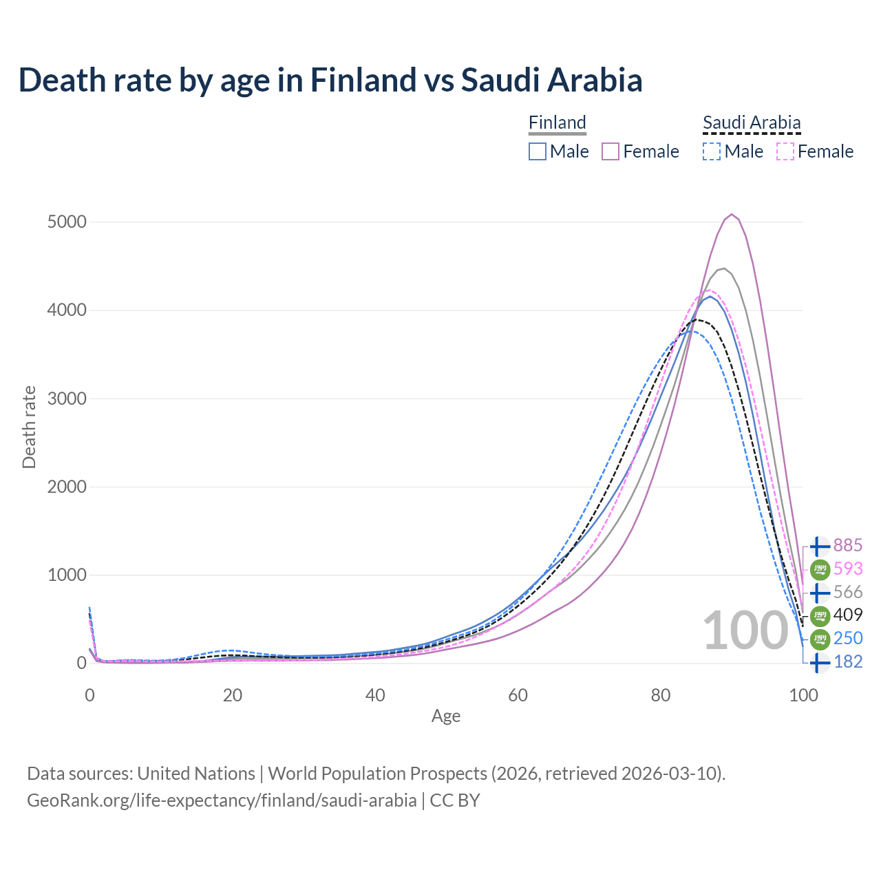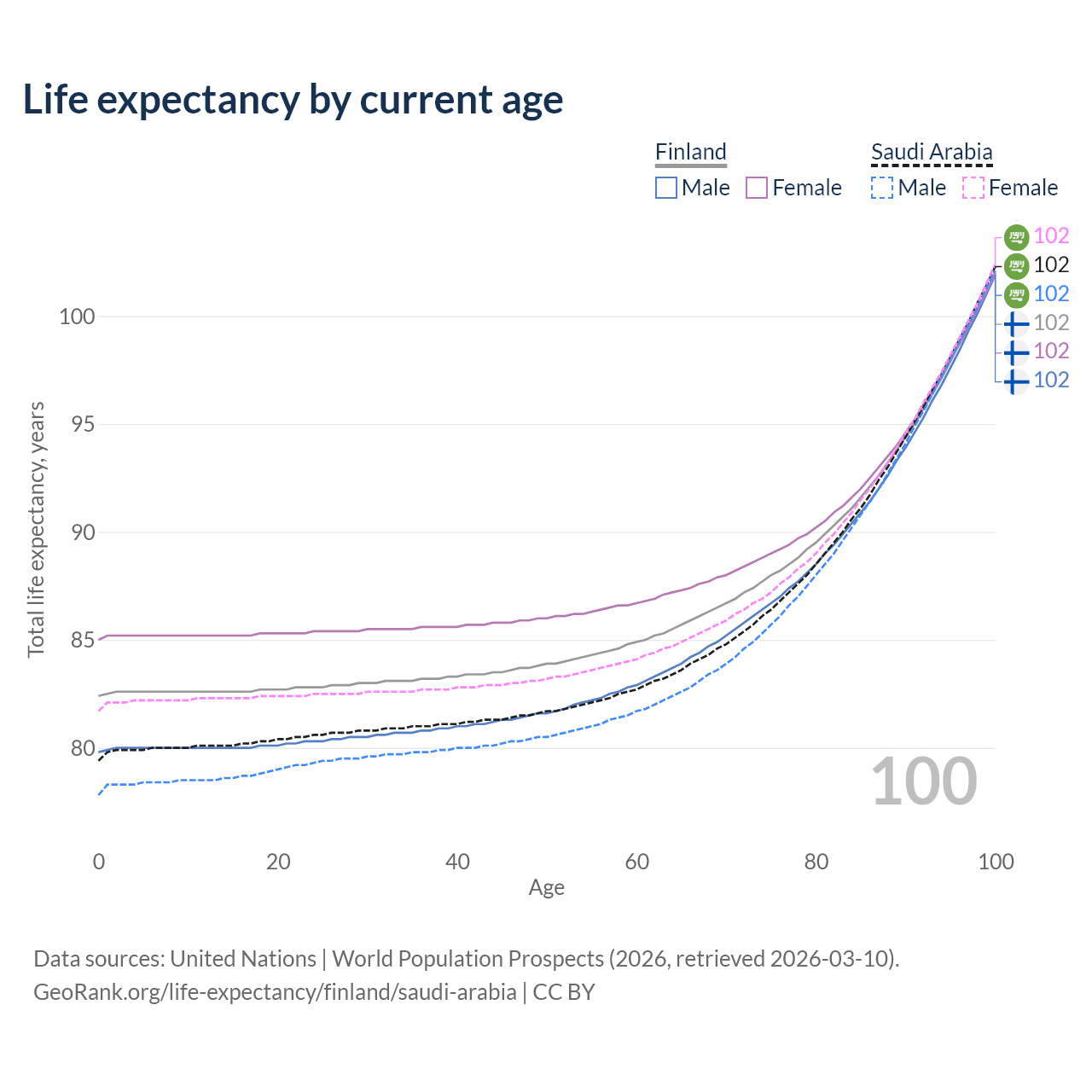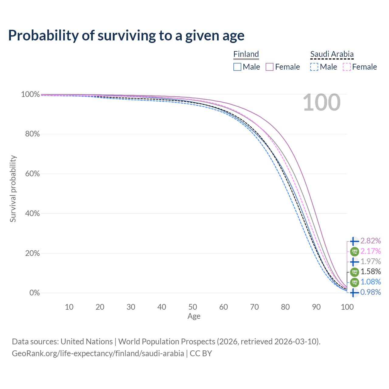 This life expectancy calculator shows the odds of living to 100, 95, 90, and below based on current age for both males and females in Finland and Saudi Arabia, along with mean and median age of death. The calculations are based on the 2026 life tables (actuarial tables) from the UN World Population Prospects.