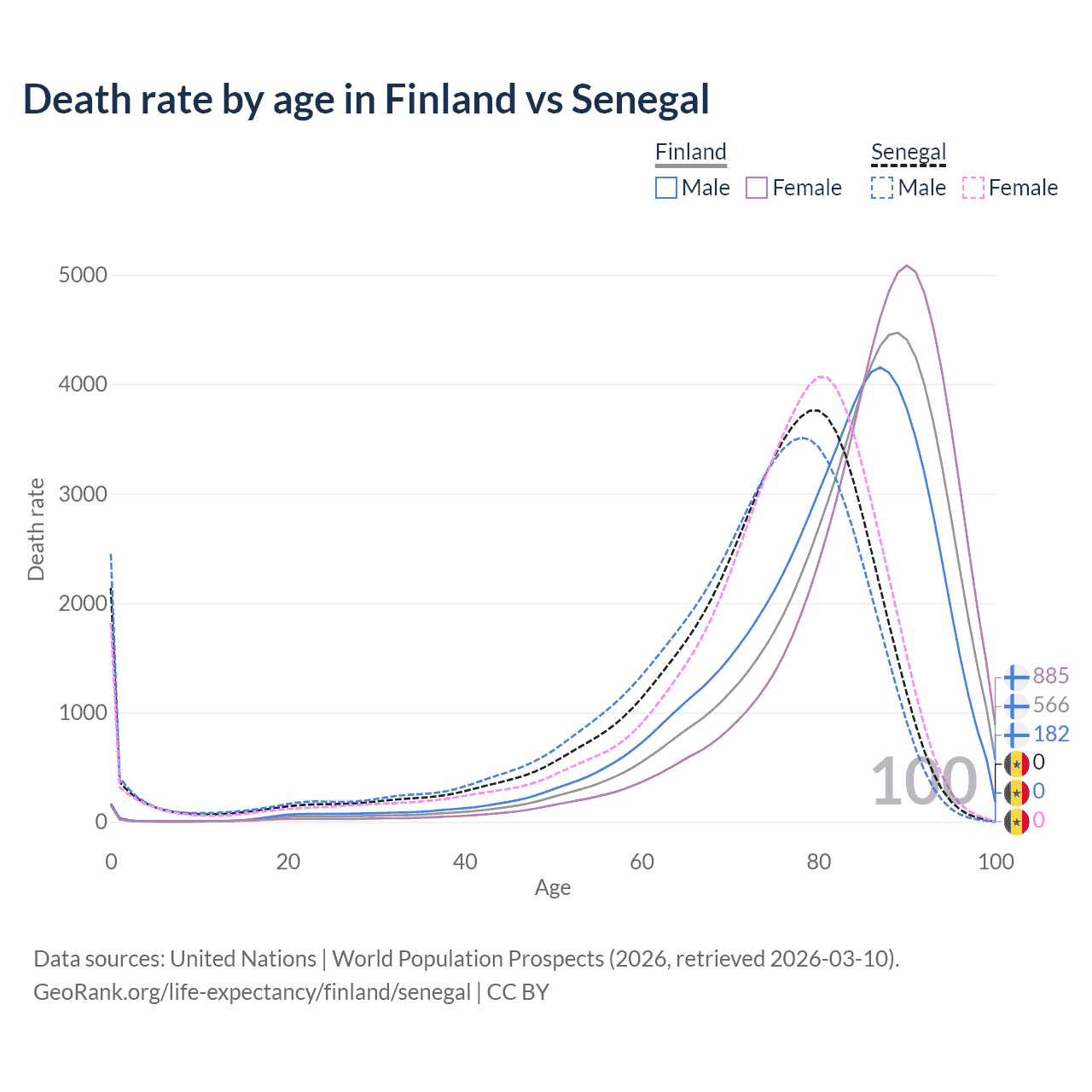 Note that this chart does not show rates per 100,000 population, as those would be skewed by age structure differences and reflect the demographics of Finland and Senegal more than their death rates.