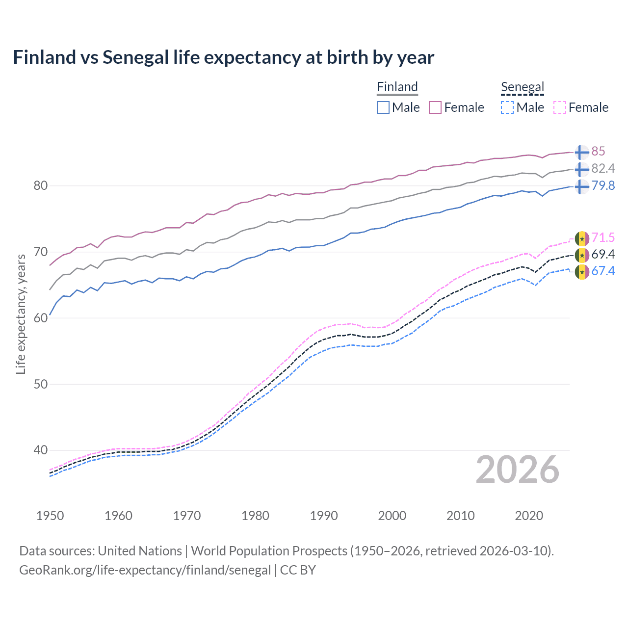 The average life expectancy at birth is 82.4 years in Finland vs 69.4 in Senegal. Finland is ranked 29/197 by life expectancy, and Senegal is 143/197. In Finland, the life expectancy is 79.8 years for males and 85 years for females. In Senegal, it's 67.4 years for males and 71.5 years for females.
