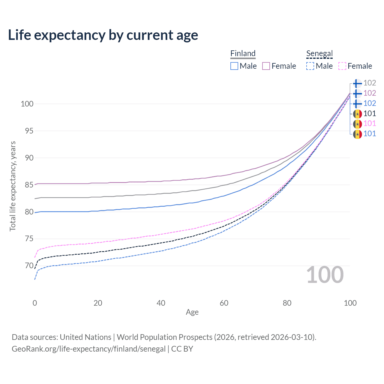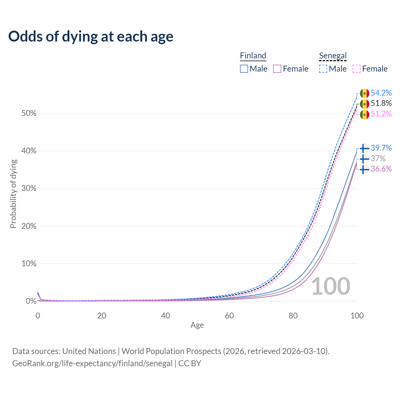 This life expectancy calculator shows the odds of living to 100, 95, 90, and below based on current age for both males and females in Finland and Senegal, along with mean and median age of death. The calculations are based on the 2026 life tables (actuarial tables) from the UN World Population Prospects.