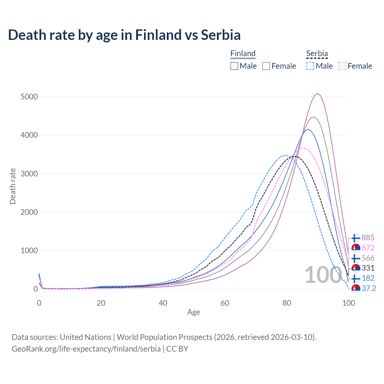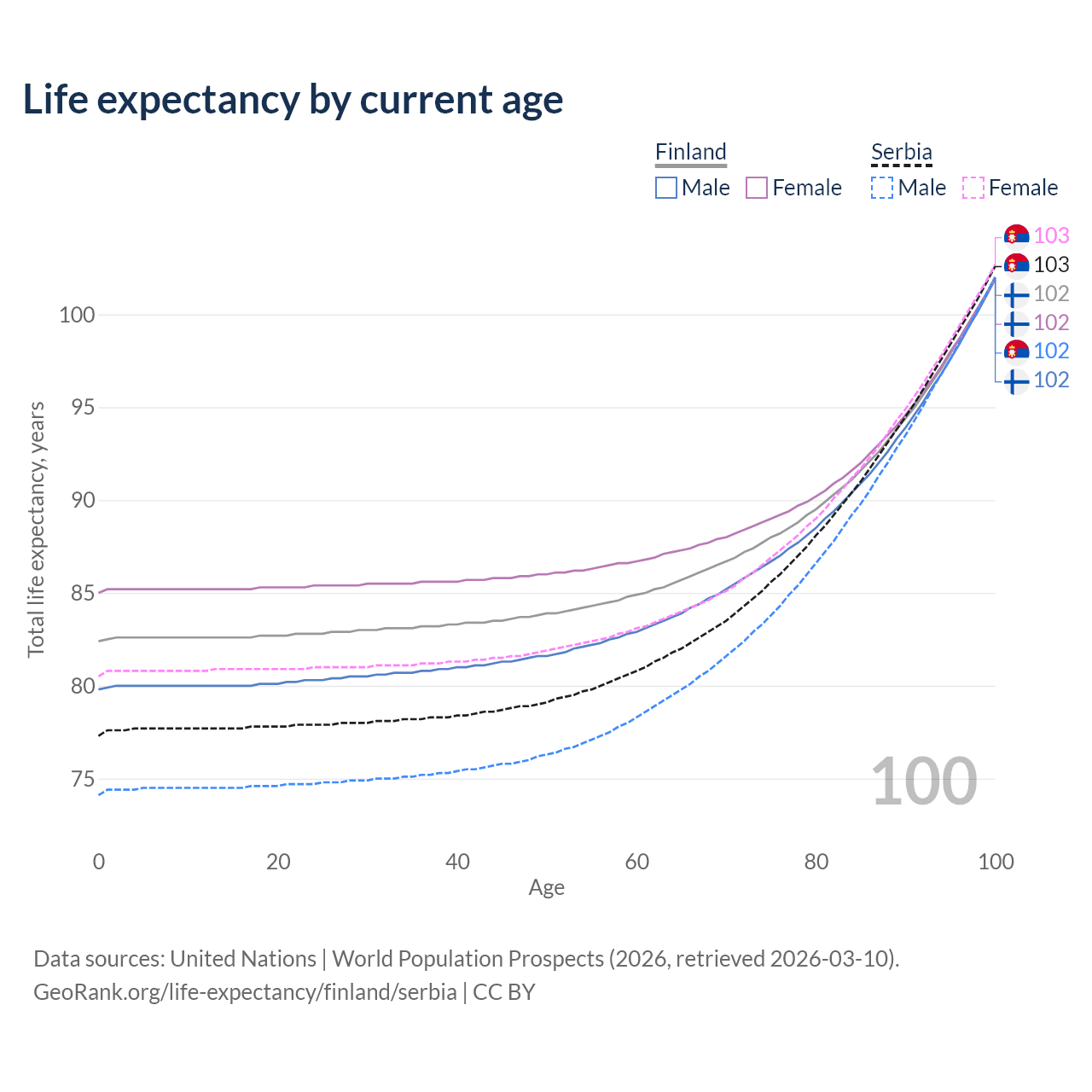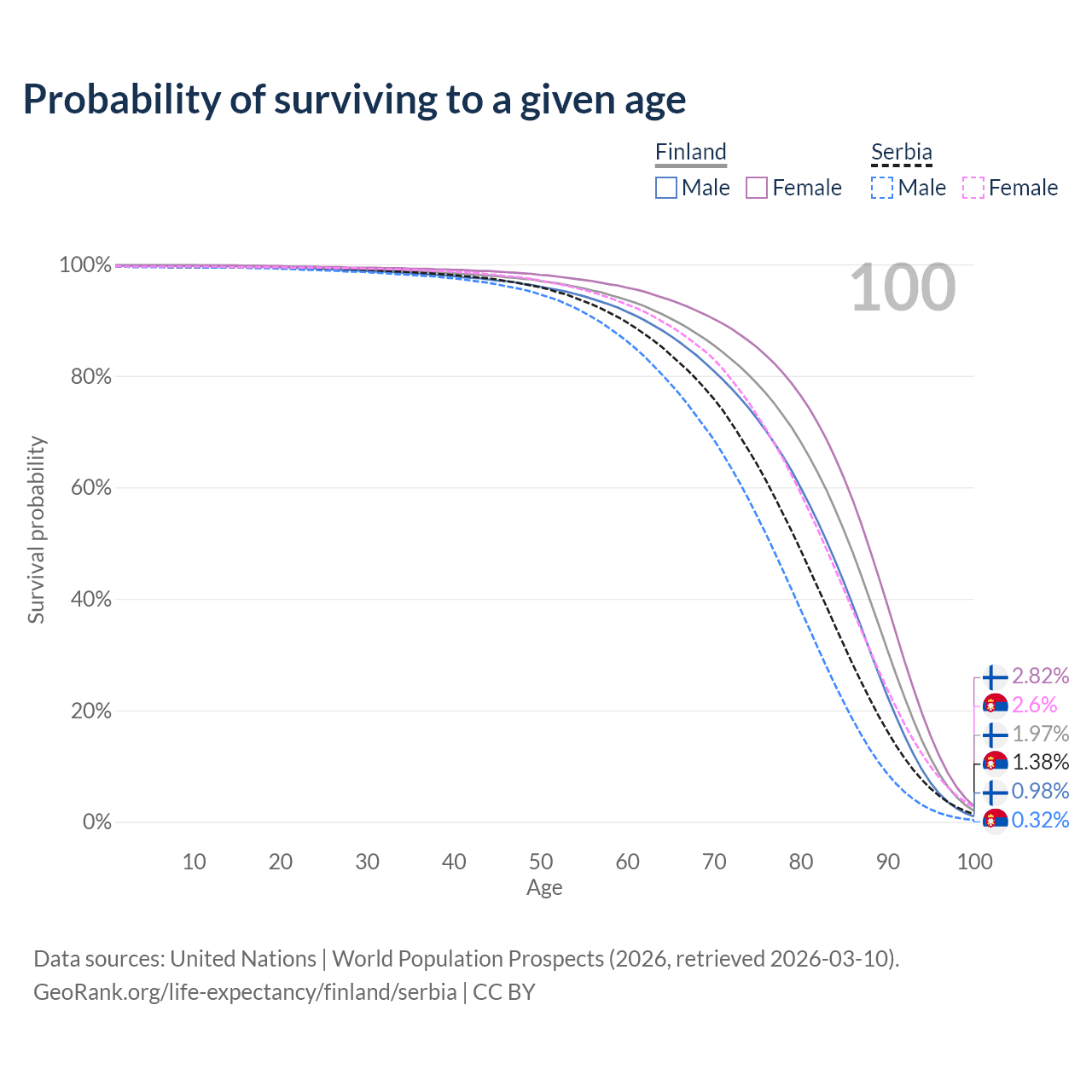 This life expectancy calculator shows the odds of living to 100, 95, 90, and below based on current age for both males and females in Finland and Serbia, along with mean and median age of death. The calculations are based on the 2026 life tables (actuarial tables) from the UN World Population Prospects.