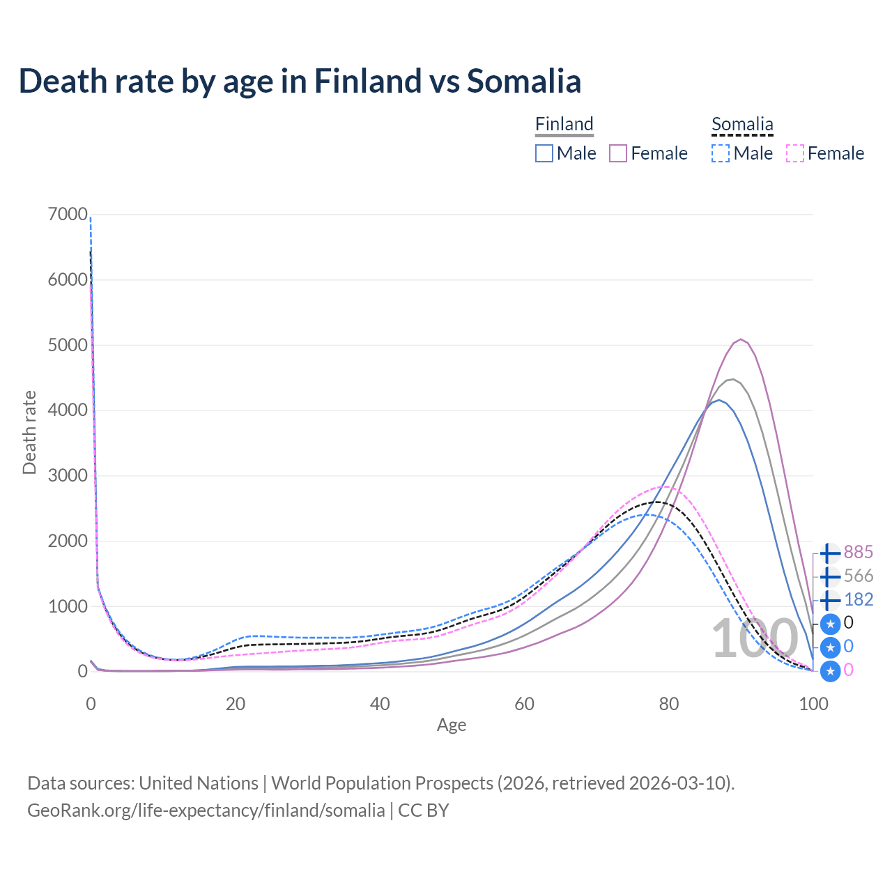 In Finland, the most common age of death is 89, compared to 0 in Somalia. The median age of death is 85.6 in Finland and 69 in Somalia, meaning only half of each cohort is expected to live past that age.