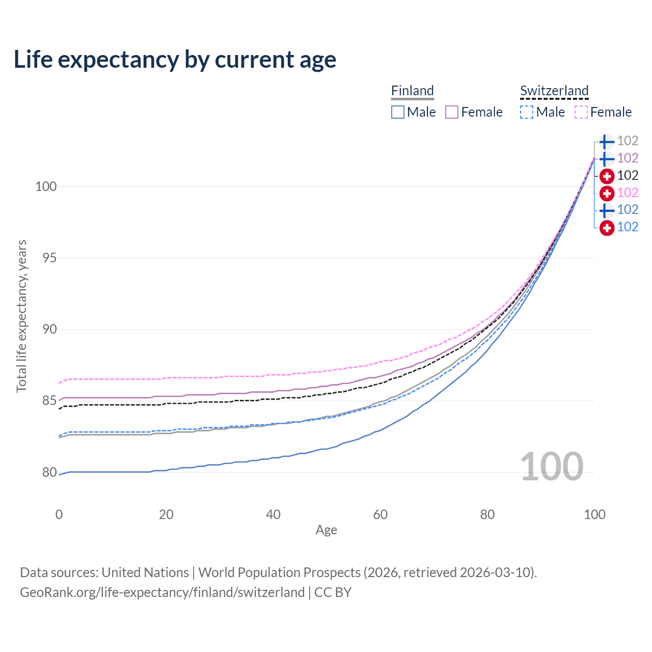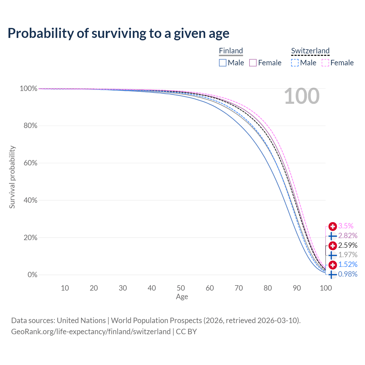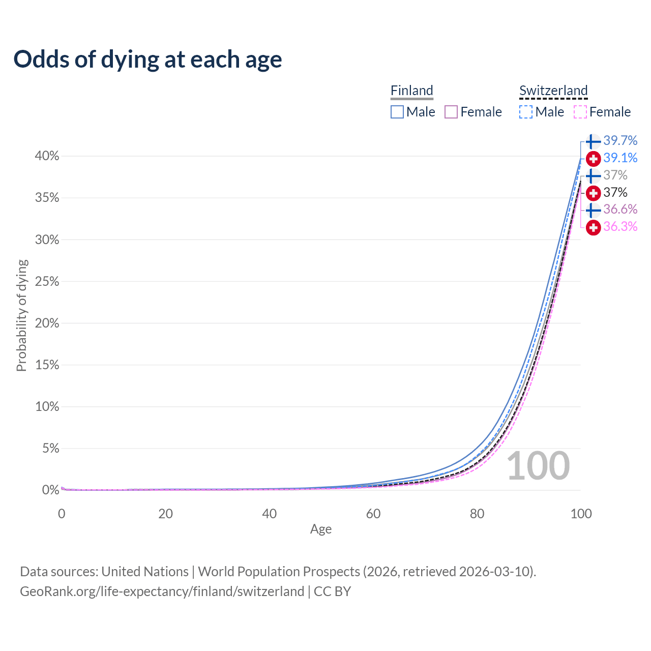 This life expectancy calculator shows the odds of living to 100, 95, 90, and below based on current age for both males and females in Finland and Switzerland, along with mean and median age of death. The calculations are based on the 2026 life tables (actuarial tables) from the UN World Population Prospects.