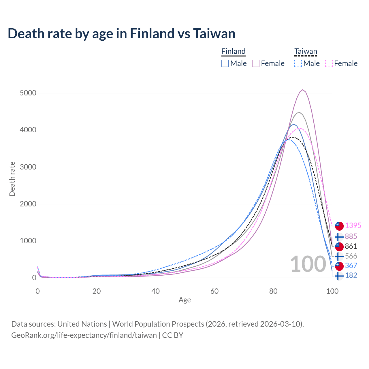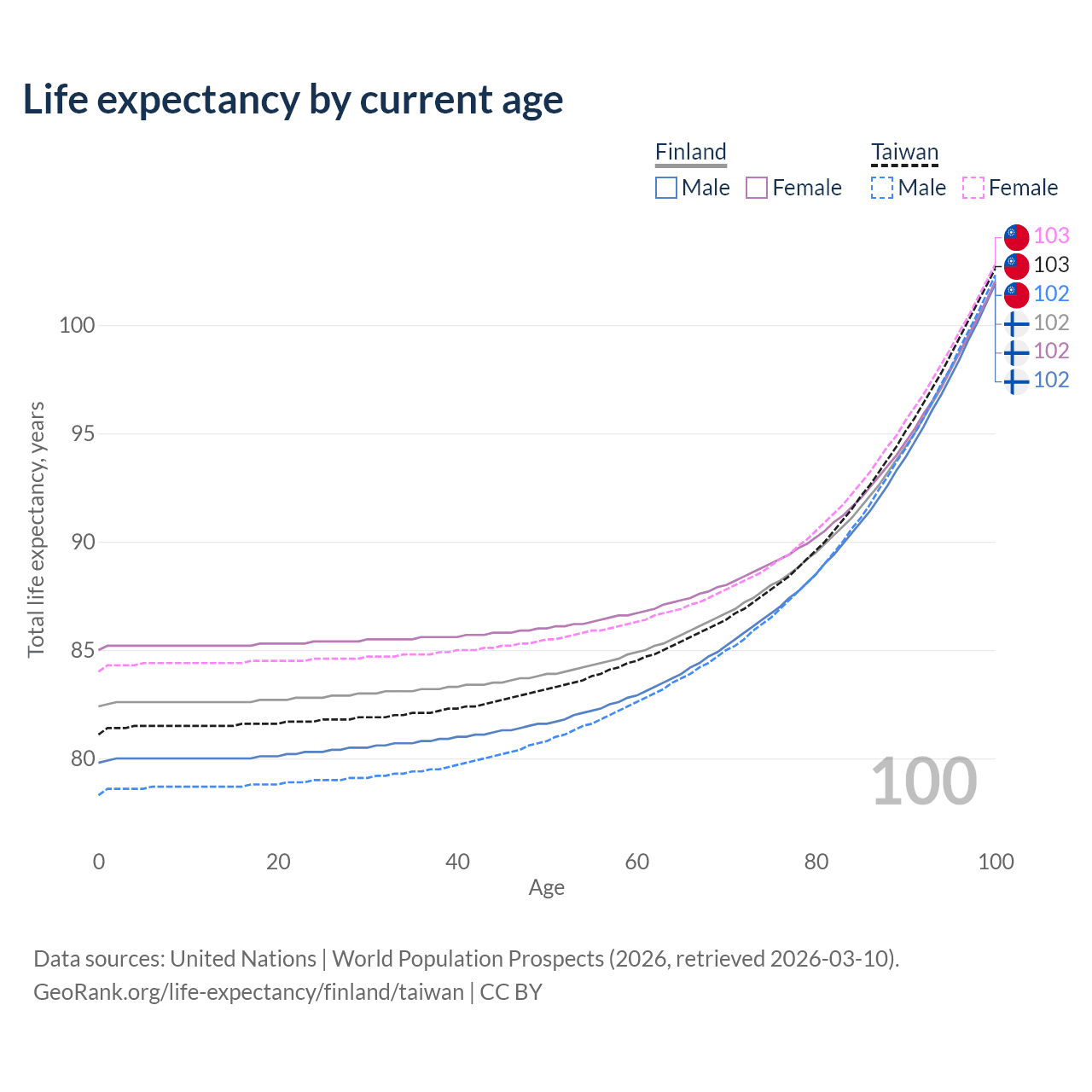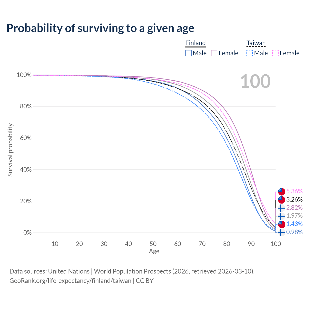 This life expectancy calculator shows the odds of living to 100, 95, 90, and below based on current age for both males and females in Finland and Taiwan, along with mean and median age of death. The calculations are based on the 2026 life tables (actuarial tables) from the UN World Population Prospects.