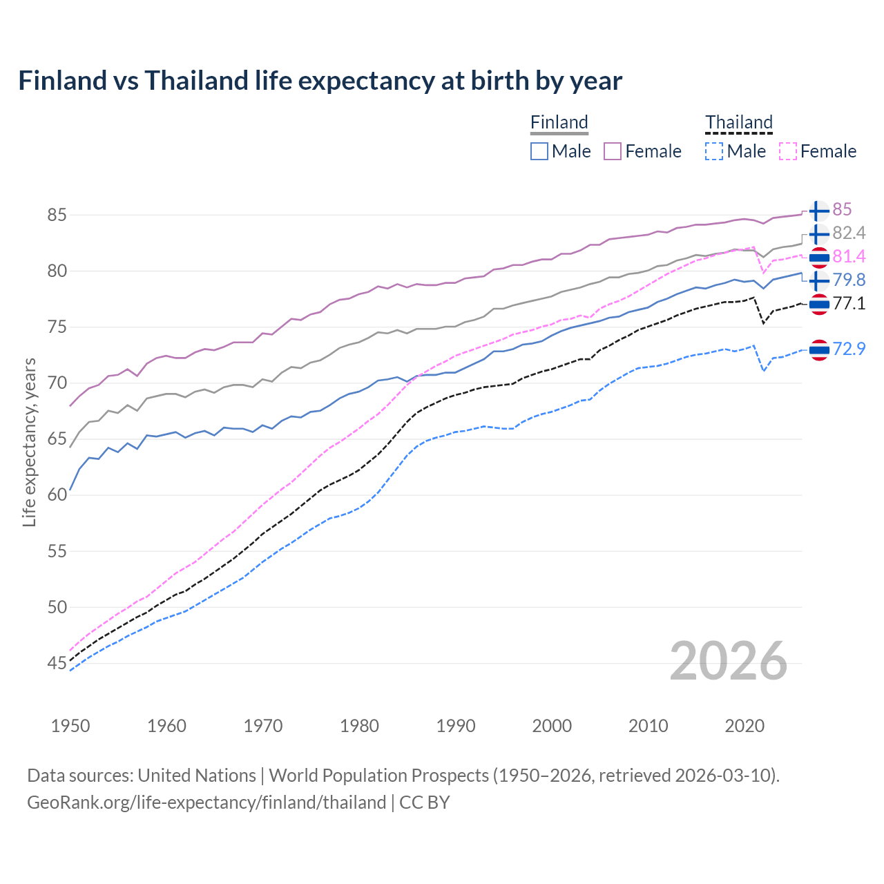 The average life expectancy at birth is 82.4 years in Finland vs 77.1 in Thailand. Finland is ranked 29/197 by life expectancy, and Thailand is 75/197. In Finland, the life expectancy is 79.8 years for males and 85 years for females. In Thailand, it's 72.9 years for males and 81.4 years for females.