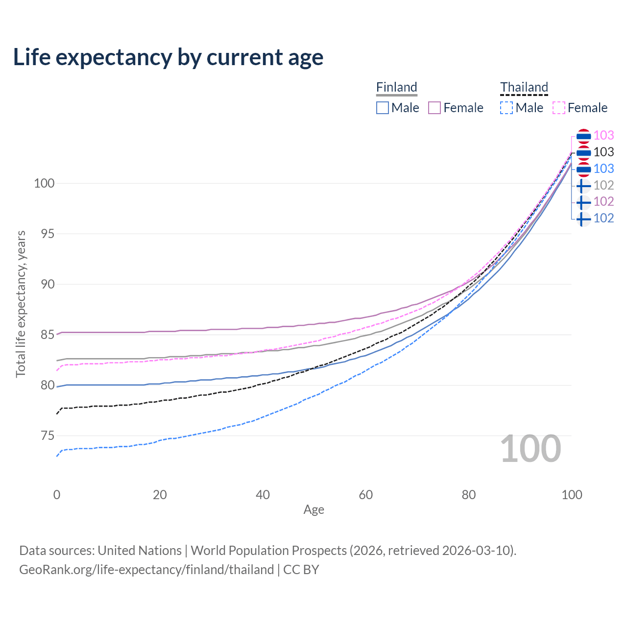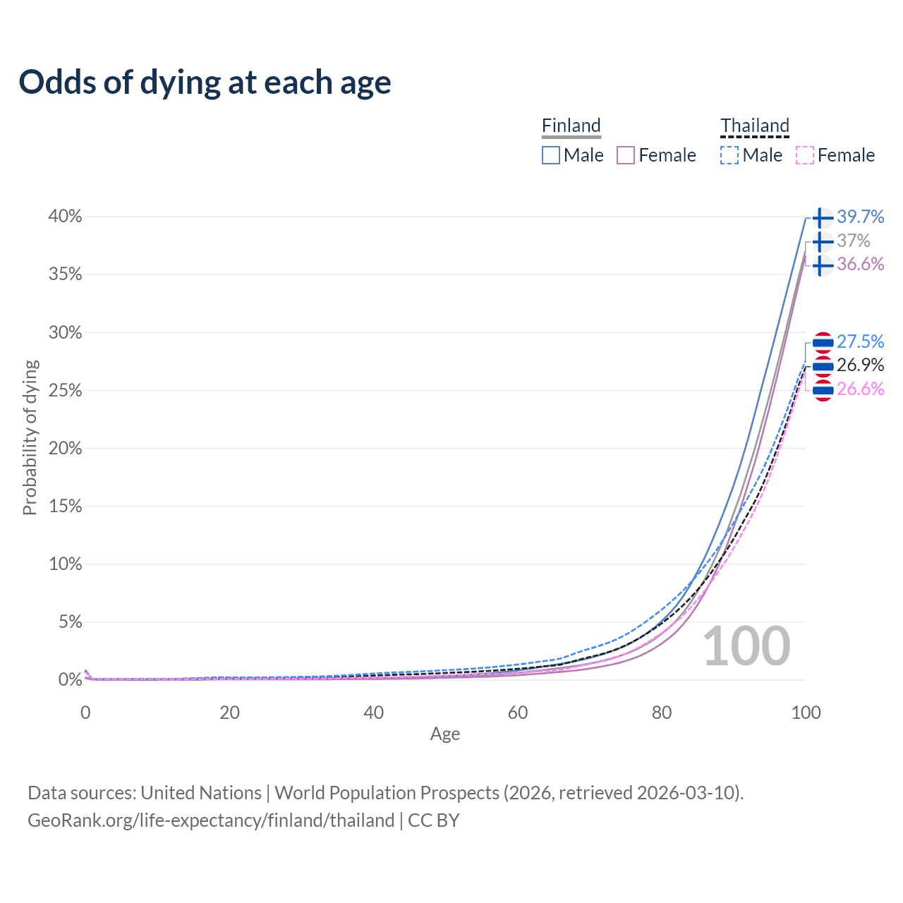 This life expectancy calculator shows the odds of living to 100, 95, 90, and below based on current age for both males and females in Finland and Thailand, along with mean and median age of death. The calculations are based on the 2026 life tables (actuarial tables) from the UN World Population Prospects.