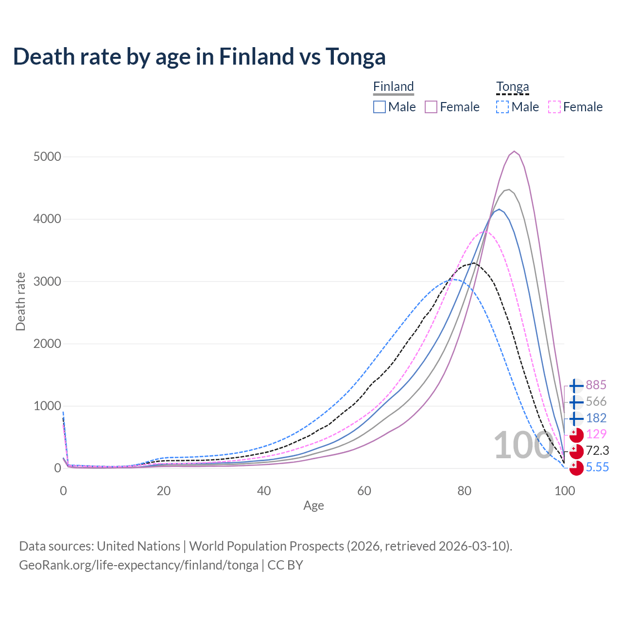 This life expectancy calculator shows the odds of living to 100, 95, 90, and below based on current age for both males and females in Finland and Tonga, along with mean and median age of death. The calculations are based on the 2026 life tables (actuarial tables) from the UN World Population Prospects.