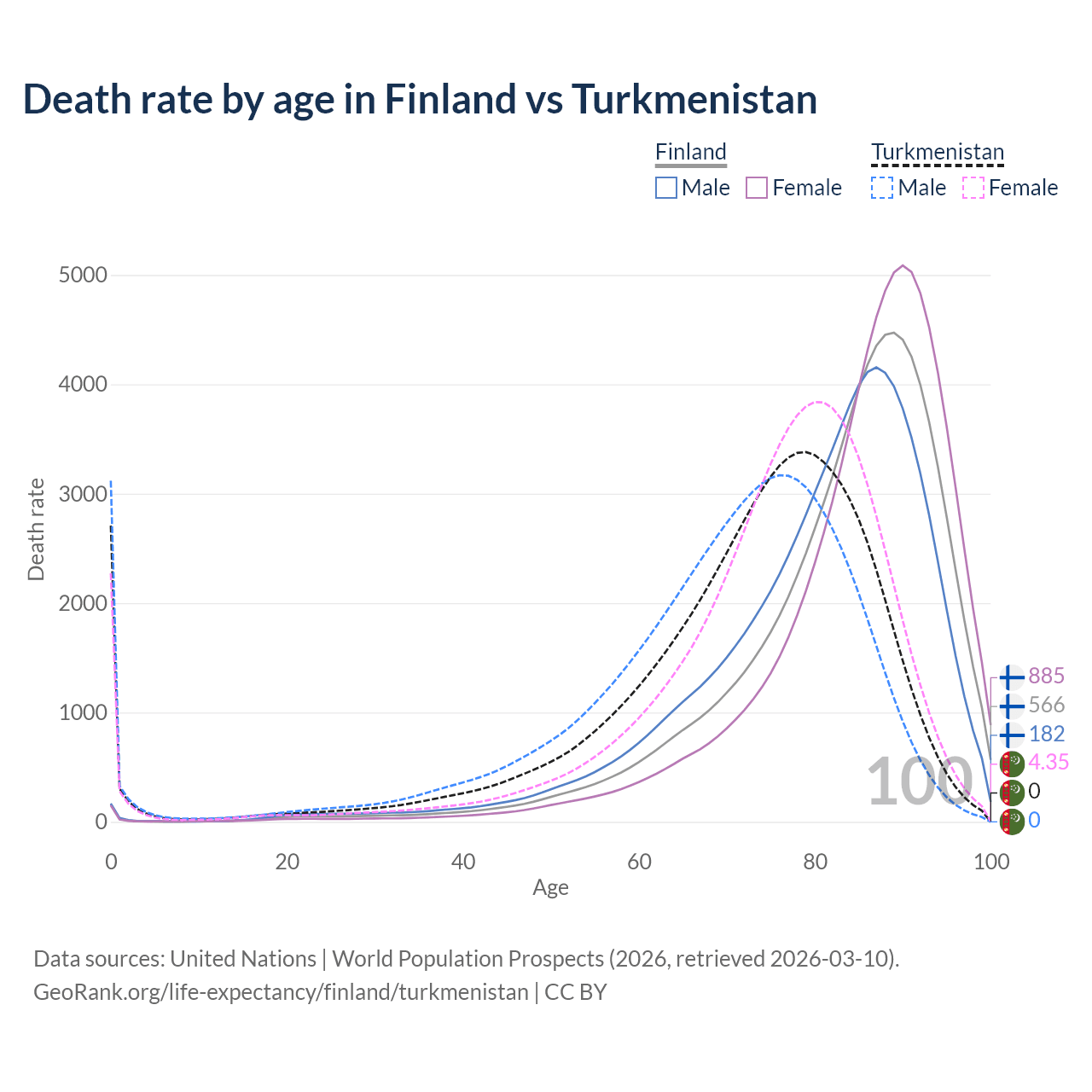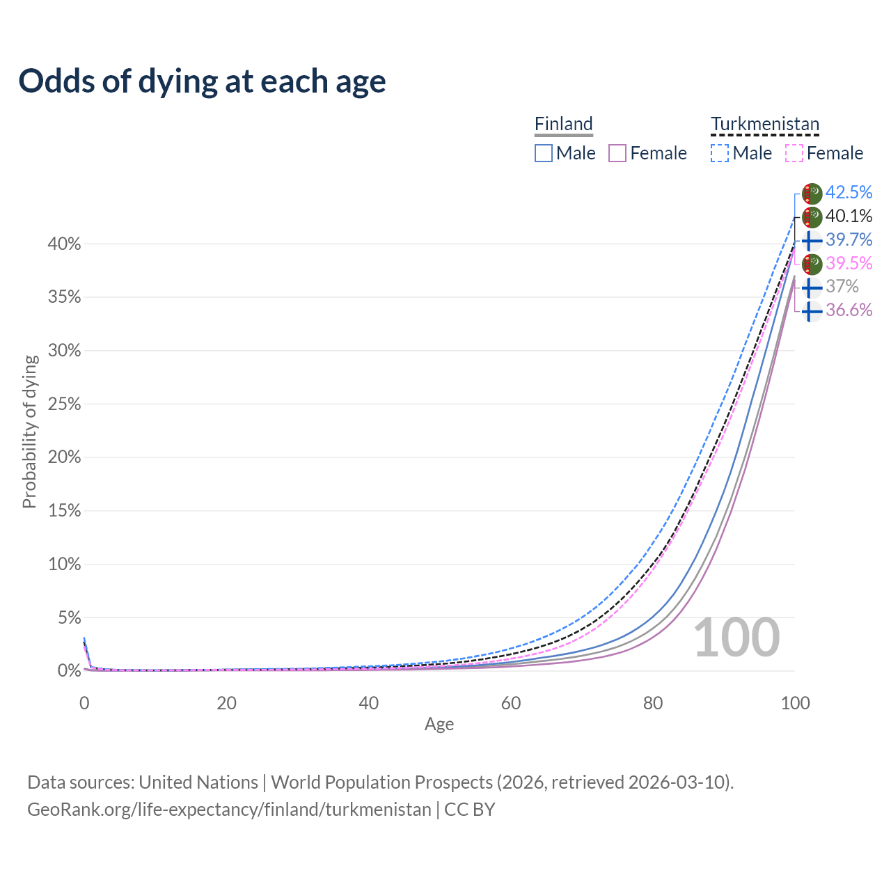 This life expectancy calculator shows the odds of living to 100, 95, 90, and below based on current age for both males and females in Finland and Turkmenistan, along with mean and median age of death. The calculations are based on the 2026 life tables (actuarial tables) from the UN World Population Prospects.