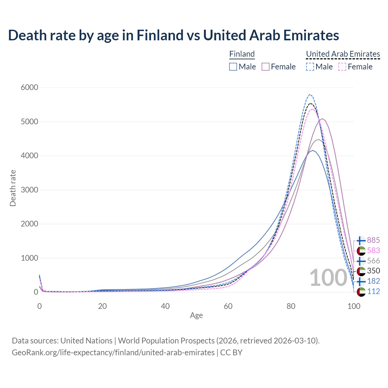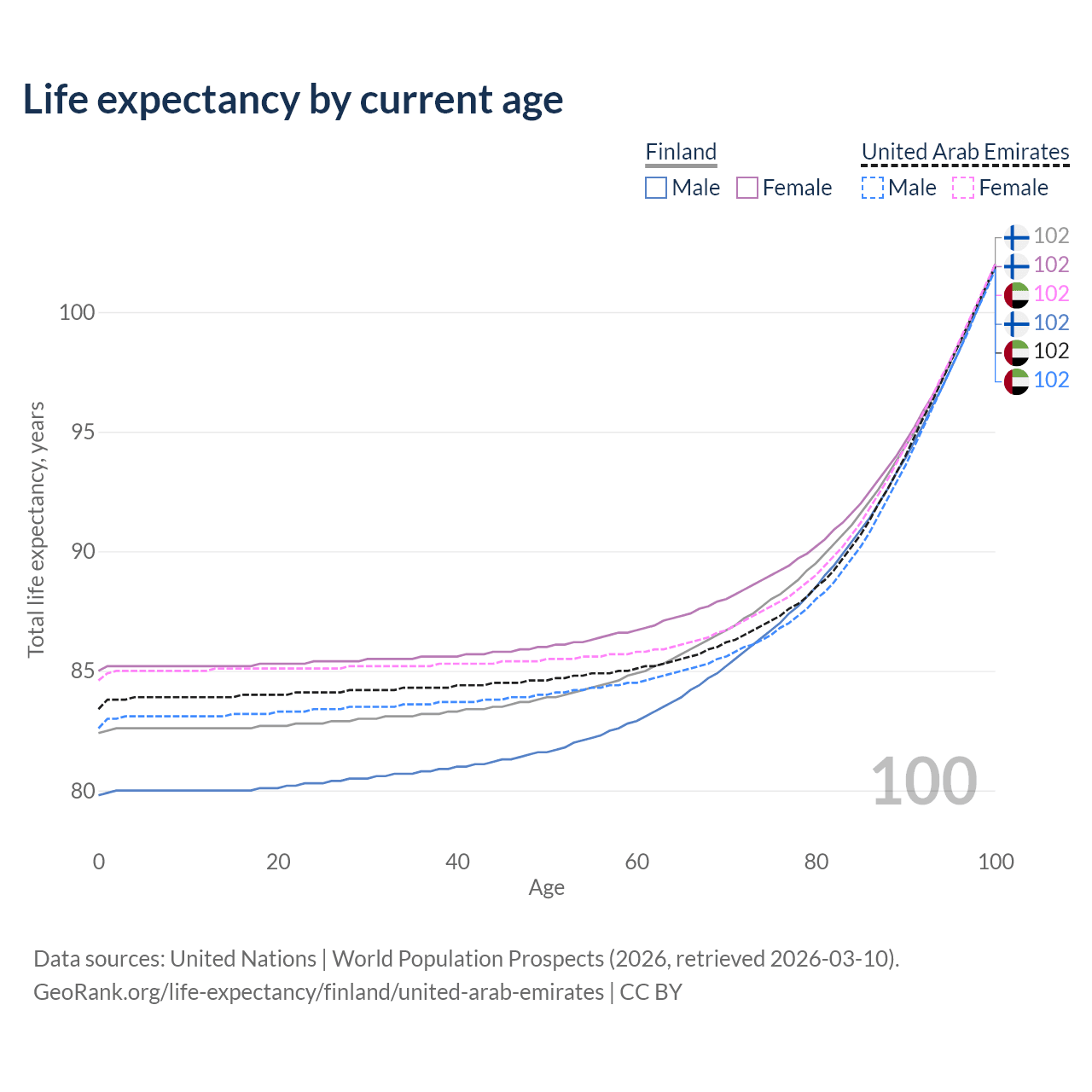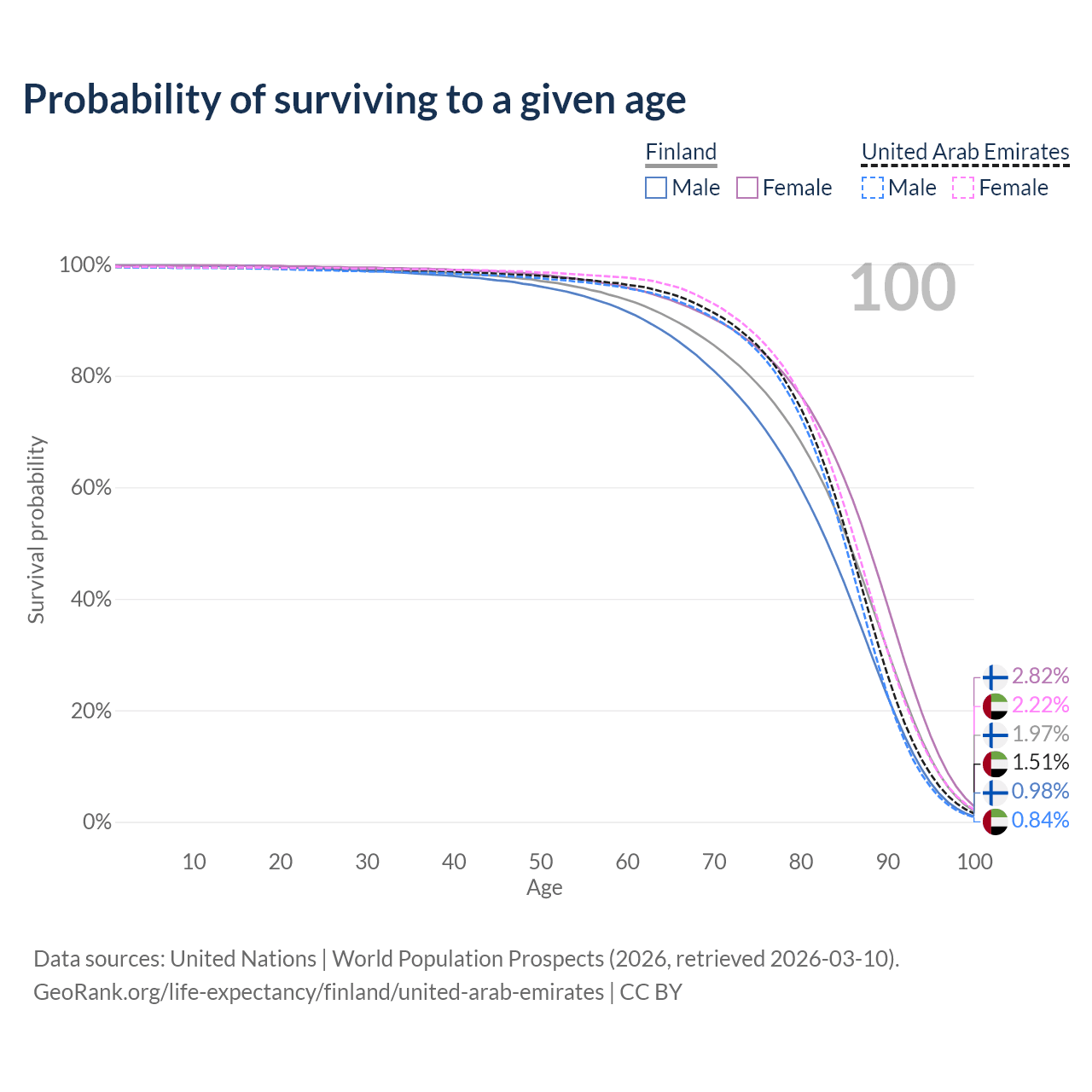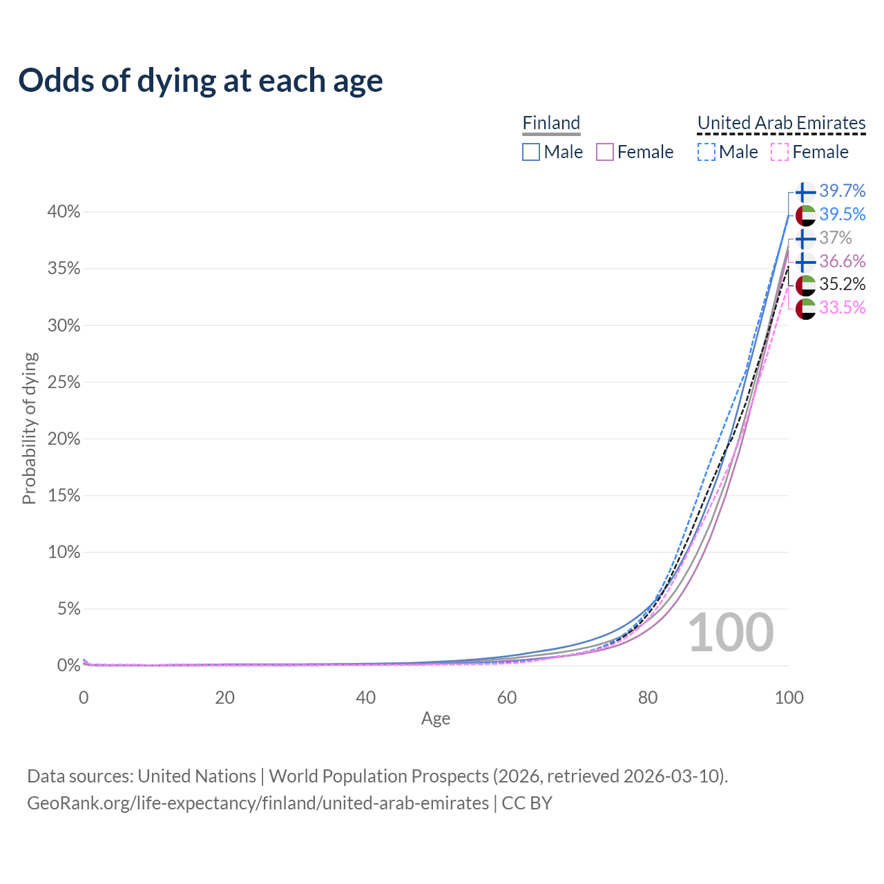 This life expectancy calculator shows the odds of living to 100, 95, 90, and below based on current age for both males and females in Finland and the United Arab Emirates, along with mean and median age of death. The calculations are based on the 2026 life tables (actuarial tables) from the UN World Population Prospects.