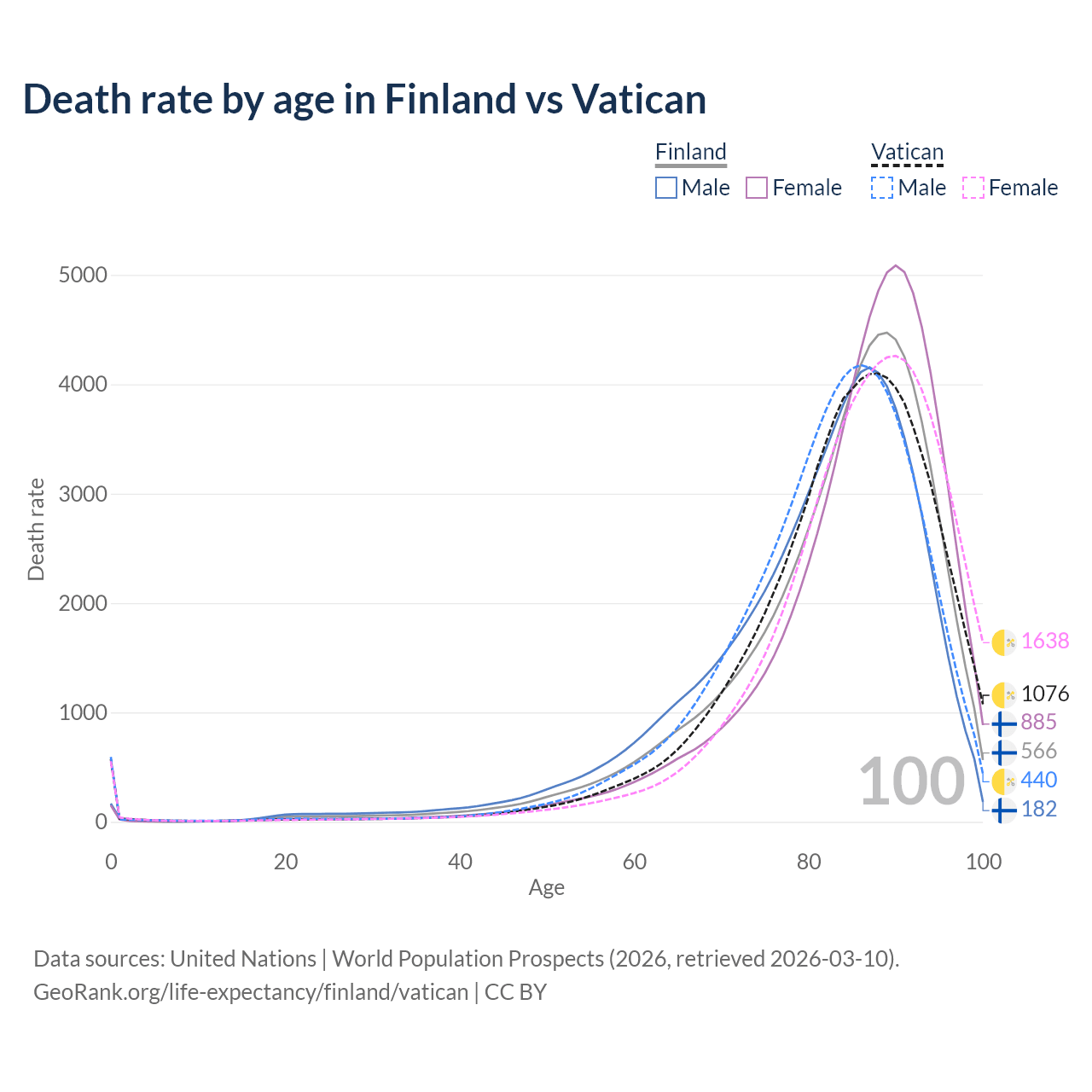 In Finland, the most common age of death is 89, compared to 88 in the Vatican. The median age of death is 85.6 in Finland and 85.7 in the Vatican, meaning only half of each cohort is expected to live past that age.