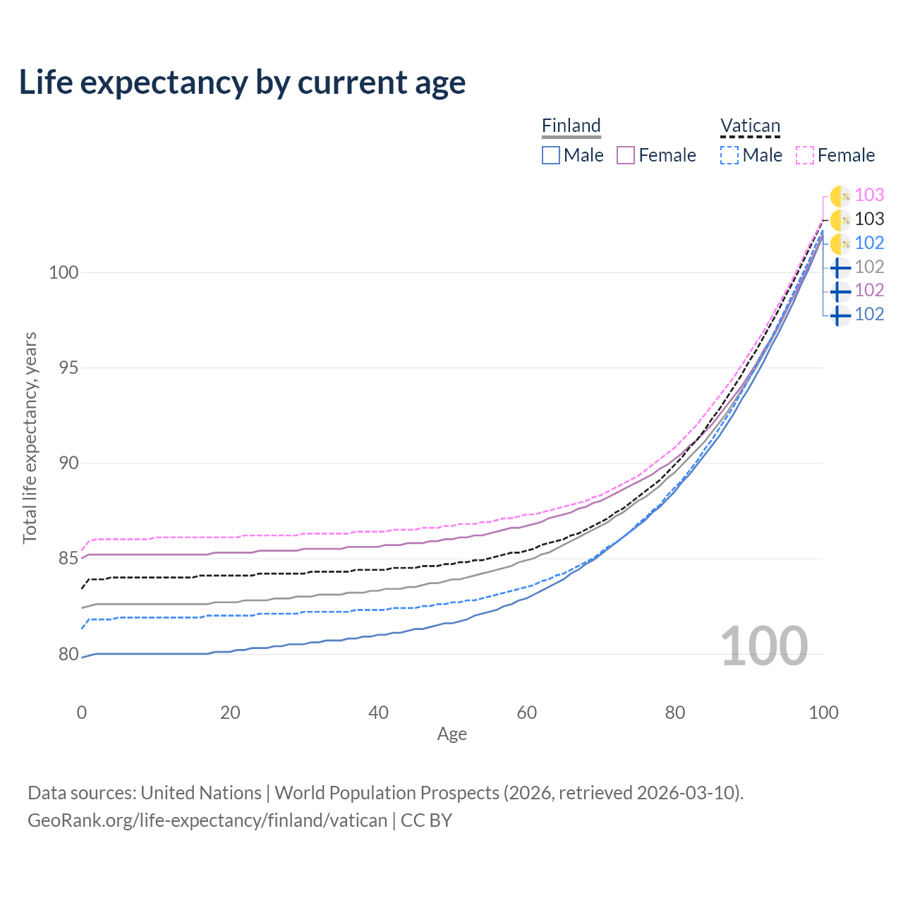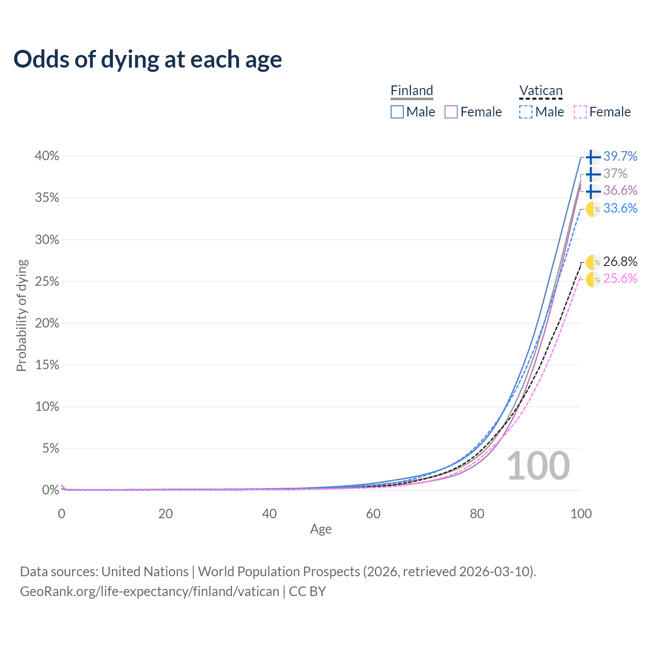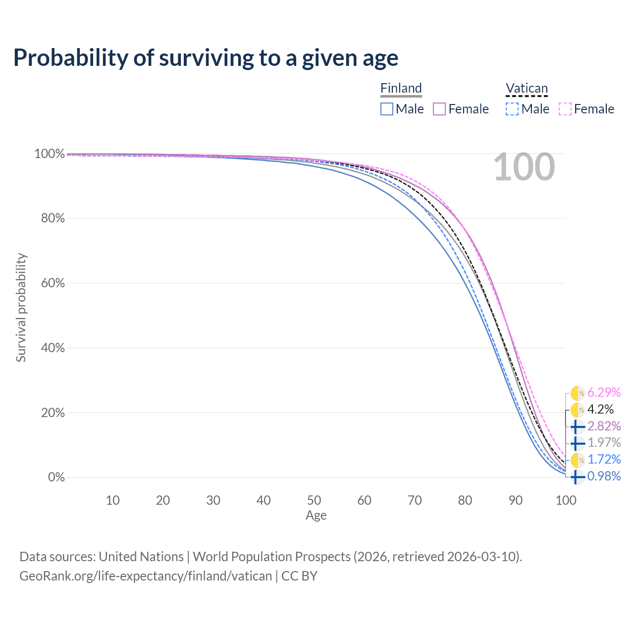 This life expectancy calculator shows the odds of living to 100, 95, 90, and below based on current age for both males and females in Finland and the Vatican, along with mean and median age of death. The calculations are based on the 2026 life tables (actuarial tables) from the UN World Population Prospects.