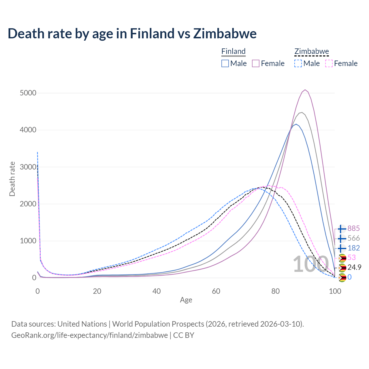 In Finland, the most common age of death is 89, compared to 0 in Zimbabwe. The median age of death is 85.6 in Finland and 68.8 in Zimbabwe, meaning only half of each cohort is expected to live past that age.