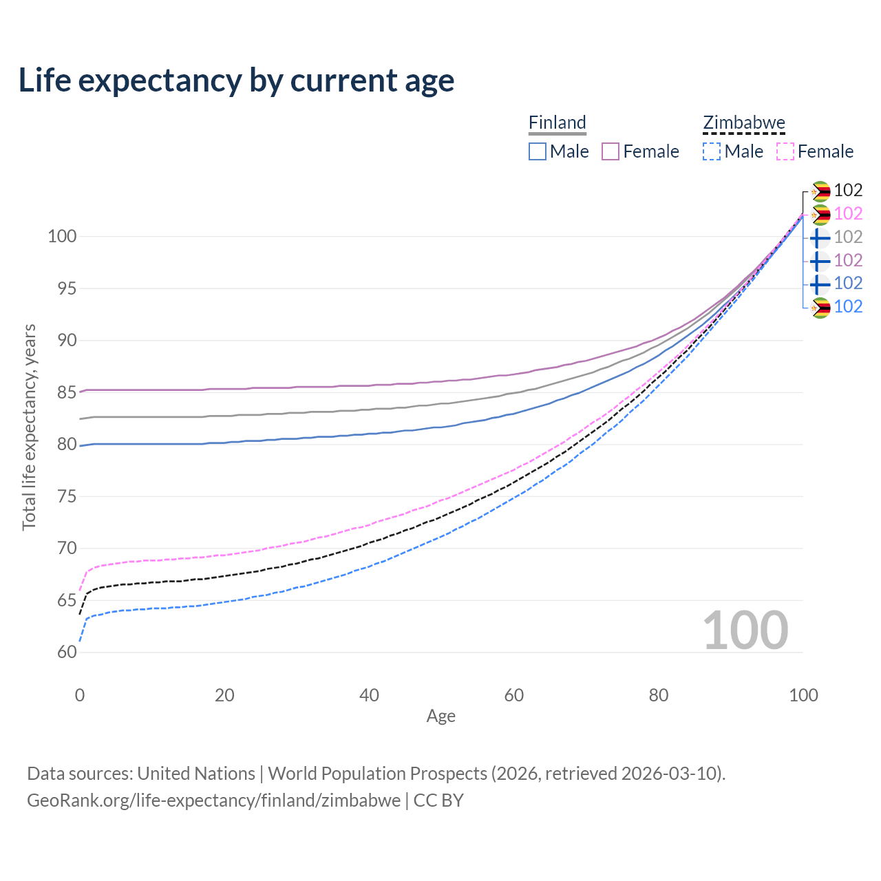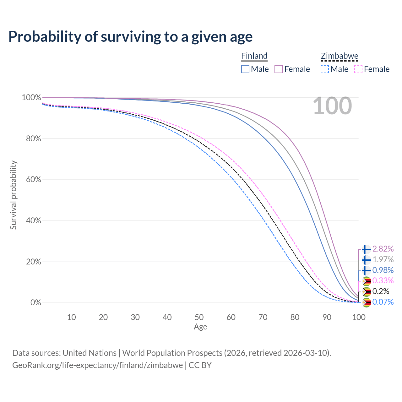 This life expectancy calculator shows the odds of living to 100, 95, 90, and below based on current age for both males and females in Finland and Zimbabwe, along with mean and median age of death. The calculations are based on the 2026 life tables (actuarial tables) from the UN World Population Prospects.