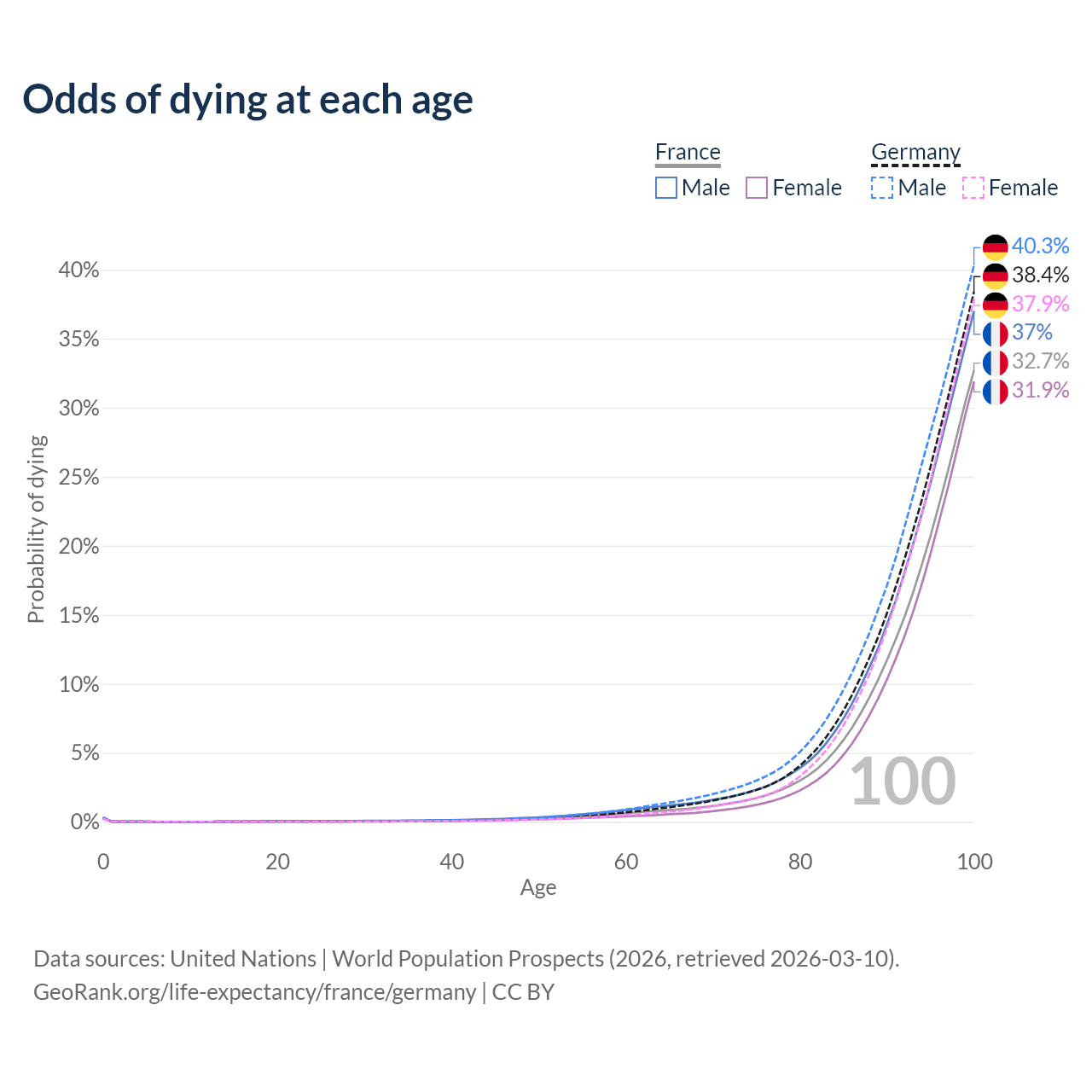 This life expectancy calculator shows the odds of living to 100, 95, 90, and below based on current age for both males and females in France and Germany, along with mean and median age of death. The calculations are based on the 2026 life tables (actuarial tables) from the UN World Population Prospects.