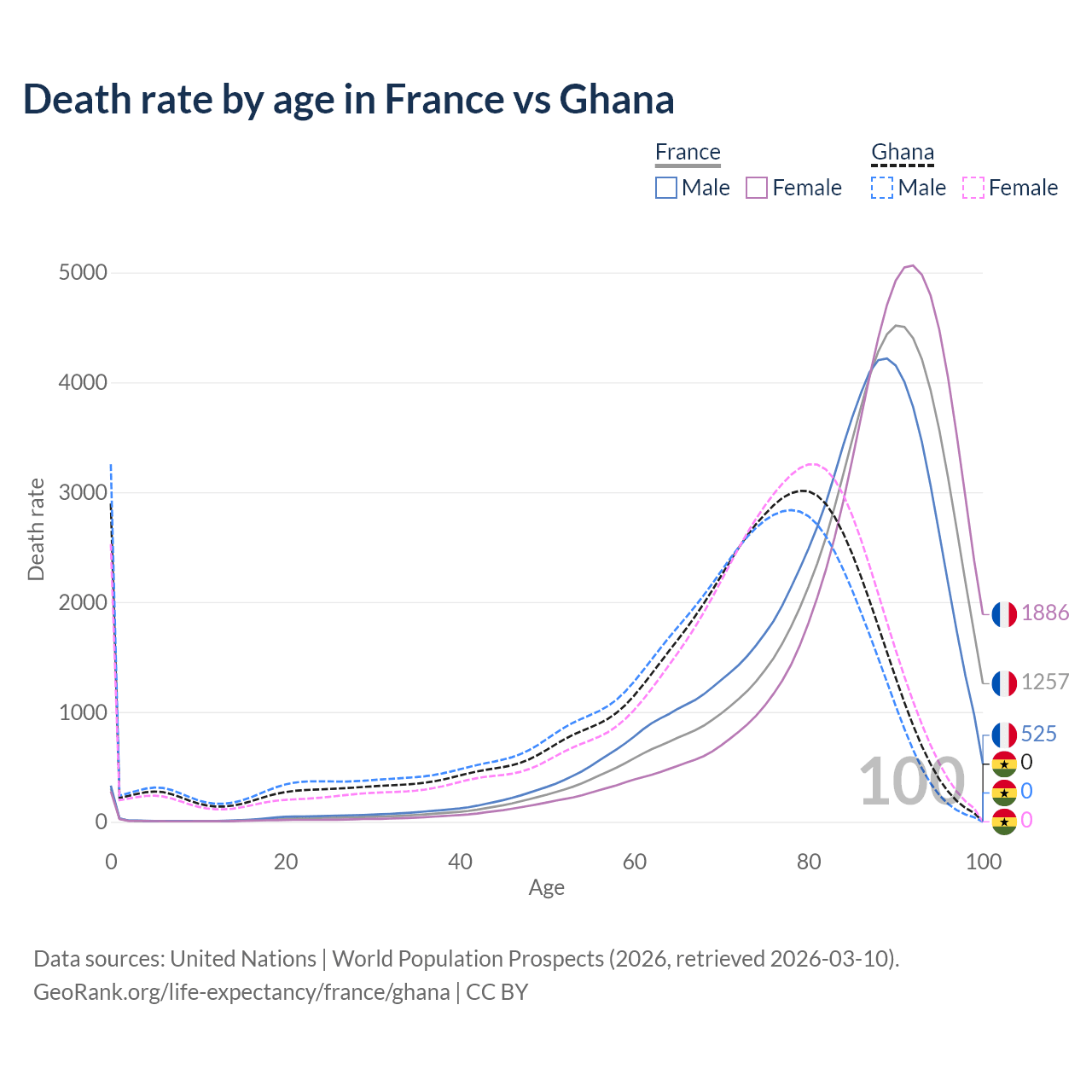 In France, the most common age of death is 90, compared to 79 in Ghana. The median age of death is 87.4 in France and 73 in Ghana, meaning only half of each cohort is expected to live past that age.