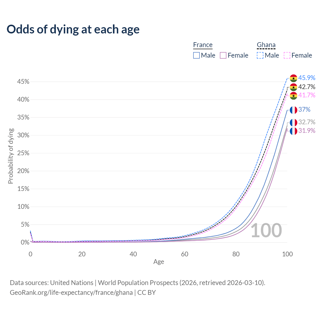 This life expectancy calculator shows the odds of living to 100, 95, 90, and below based on current age for both males and females in France and Ghana, along with mean and median age of death. The calculations are based on the 2026 life tables (actuarial tables) from the UN World Population Prospects.