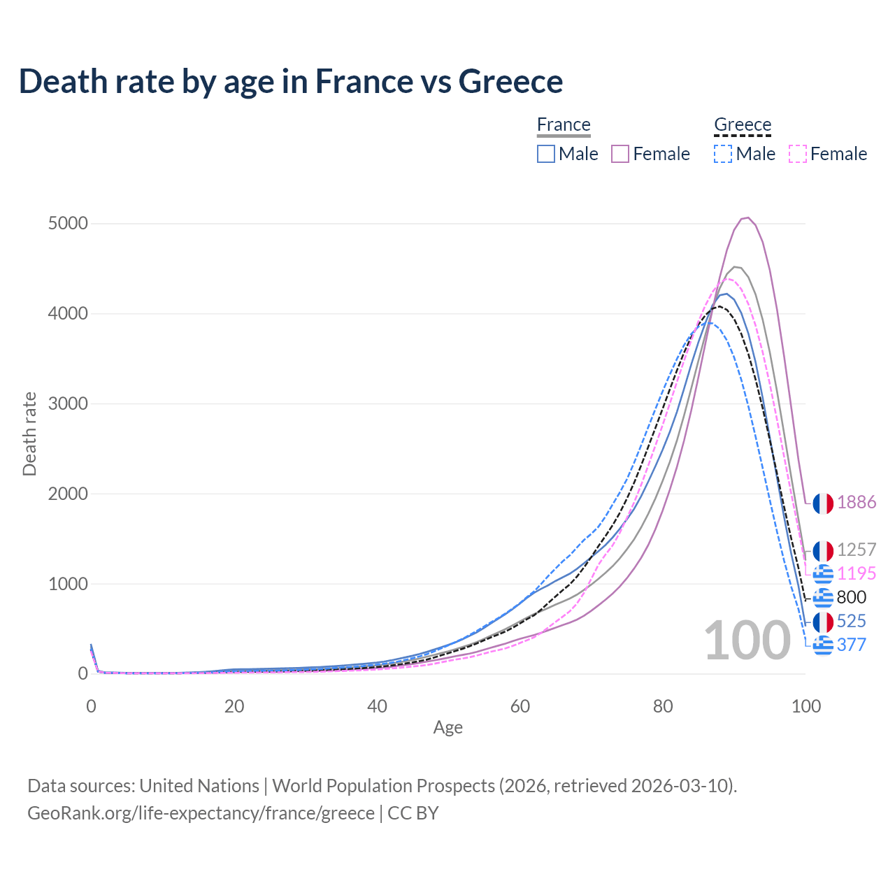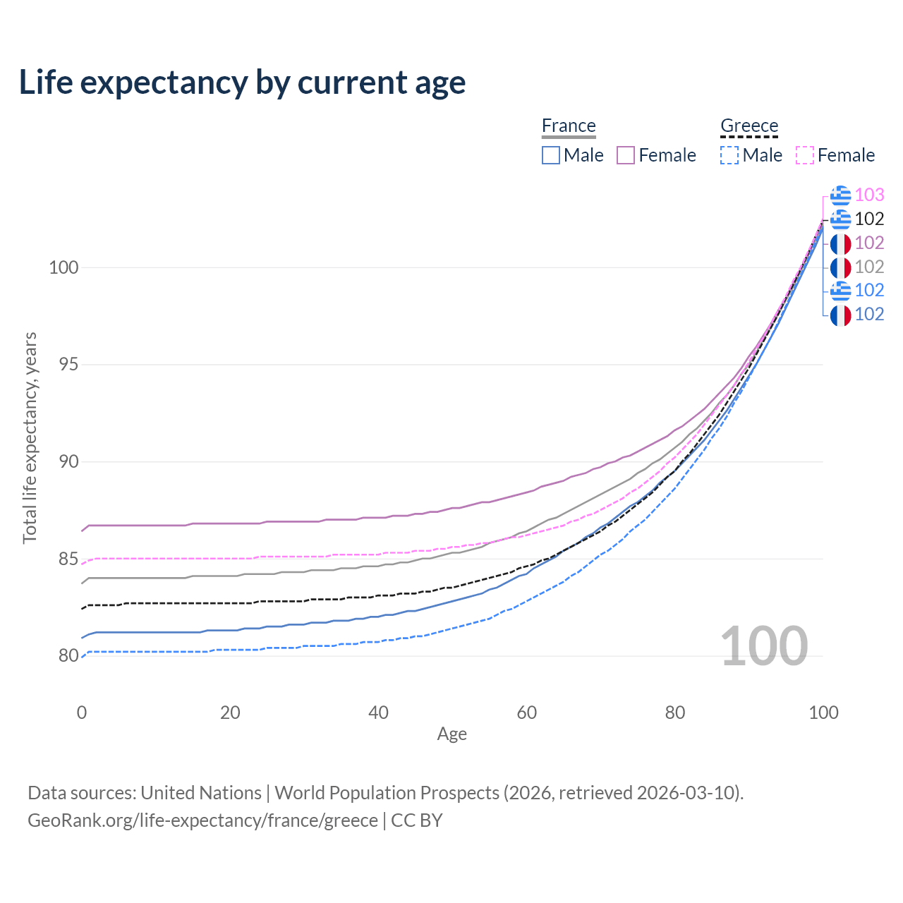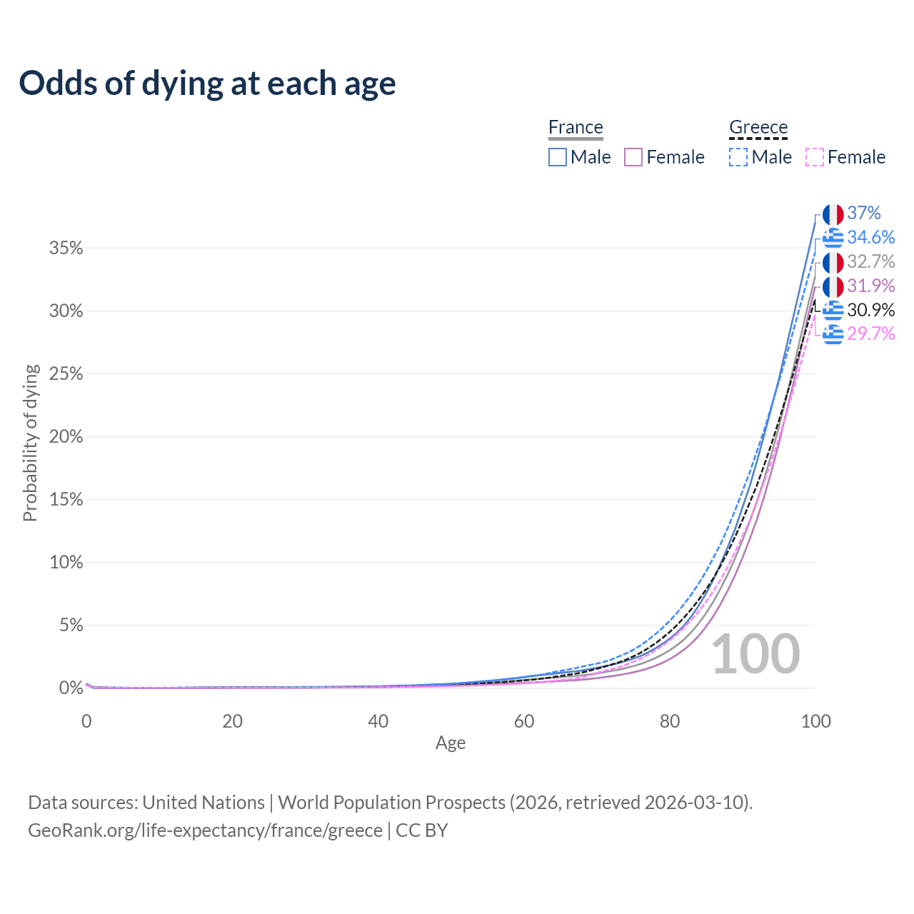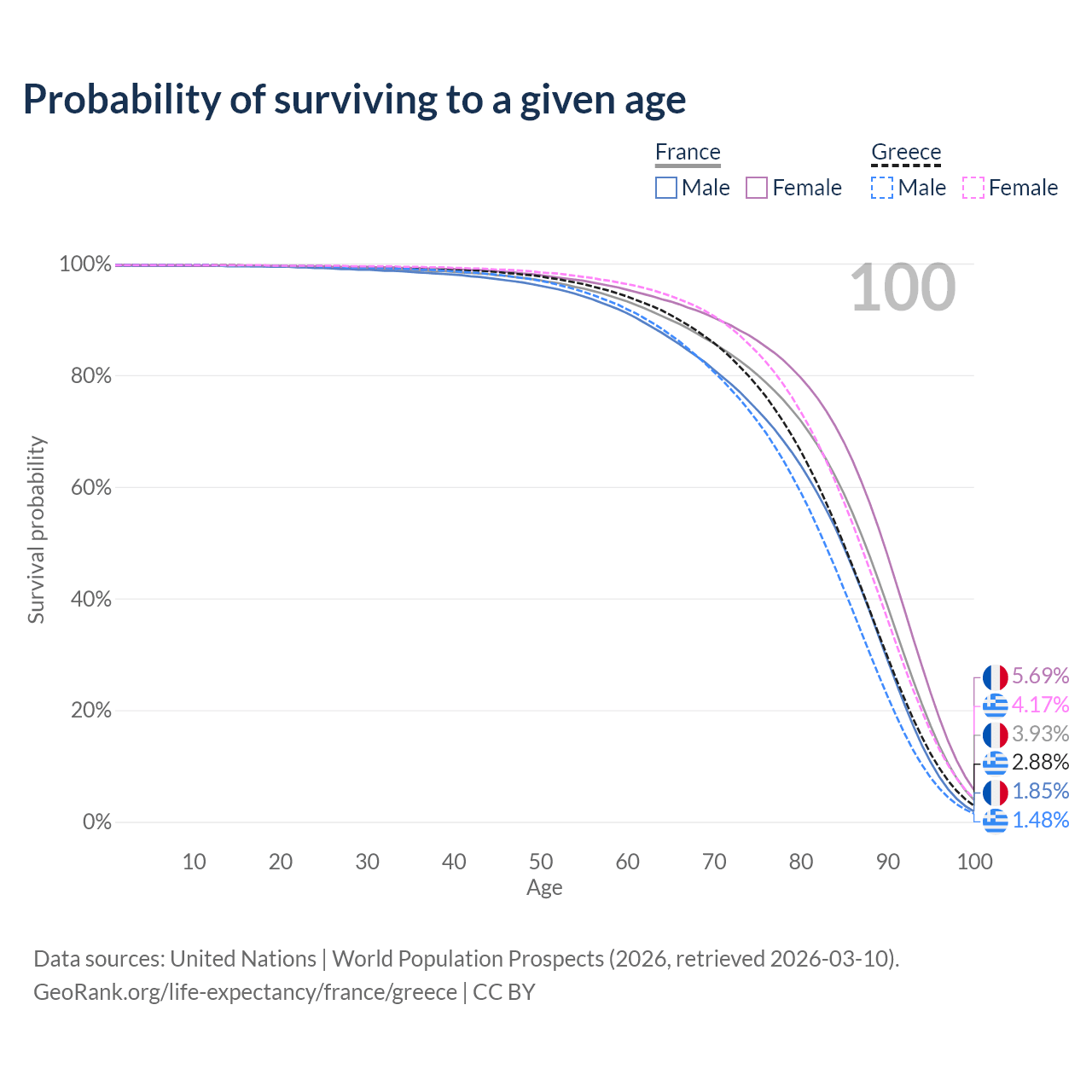 This life expectancy calculator shows the odds of living to 100, 95, 90, and below based on current age for both males and females in France and Greece, along with mean and median age of death. The calculations are based on the 2026 life tables (actuarial tables) from the UN World Population Prospects.