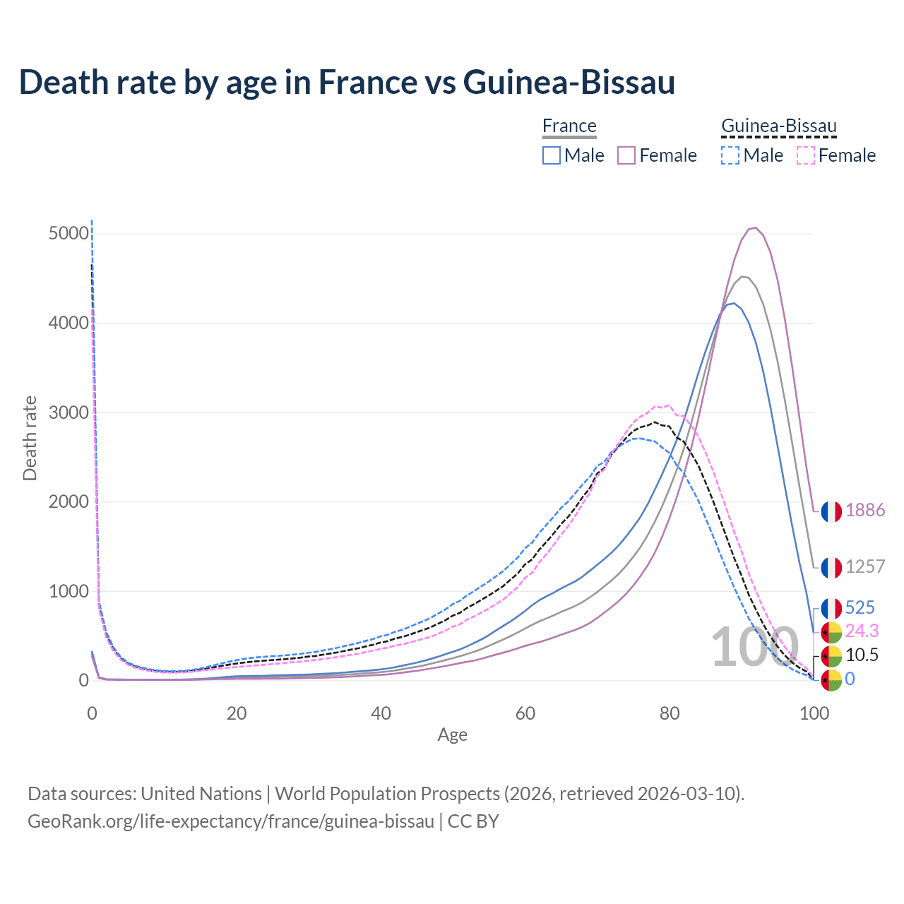 In France, the most common age of death is 90, compared to 0 in Guinea-Bissau. The median age of death is 87.4 in France and 71.8 in Guinea-Bissau, meaning only half of each cohort is expected to live past that age.