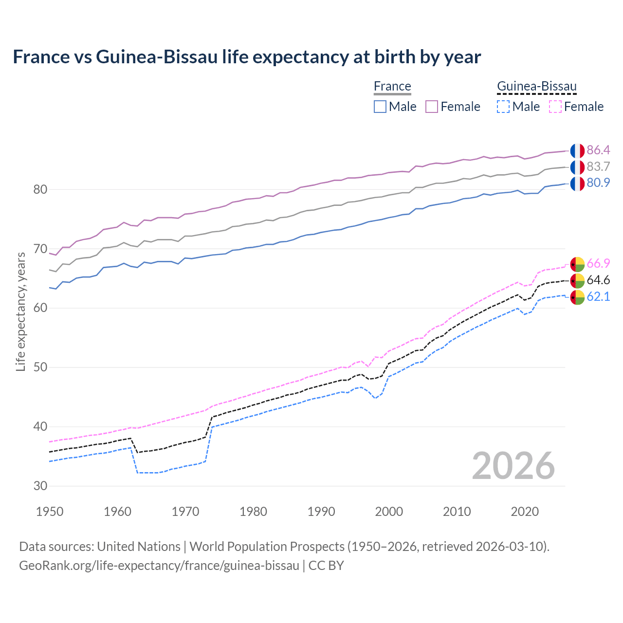 The average life expectancy at birth is 83.7 years in France vs 64.6 in Guinea-Bissau. France is ranked 15/197 by life expectancy, and Guinea-Bissau is 172/197. In France, the life expectancy is 80.9 years for males and 86.4 years for females. In Guinea-Bissau, it's 62.1 years for males and 66.9 years for females.