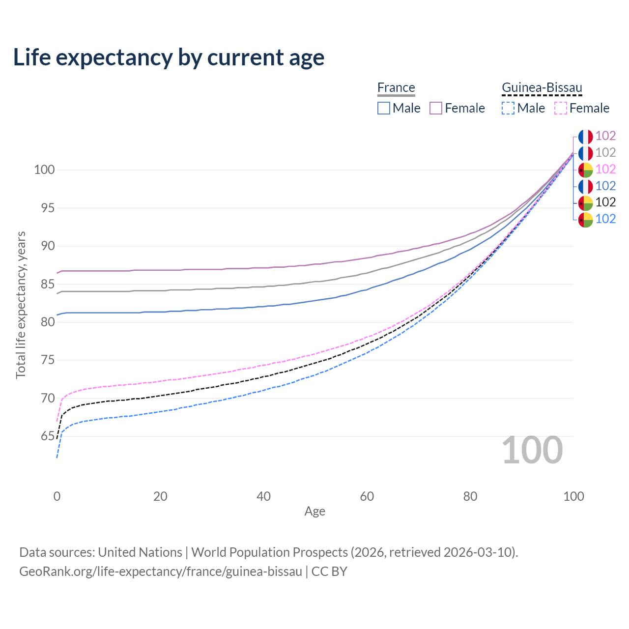 This life expectancy calculator shows the odds of living to 100, 95, 90, and below based on current age for both males and females in France and Guinea-Bissau, along with mean and median age of death. The calculations are based on the 2026 life tables (actuarial tables) from the UN World Population Prospects.